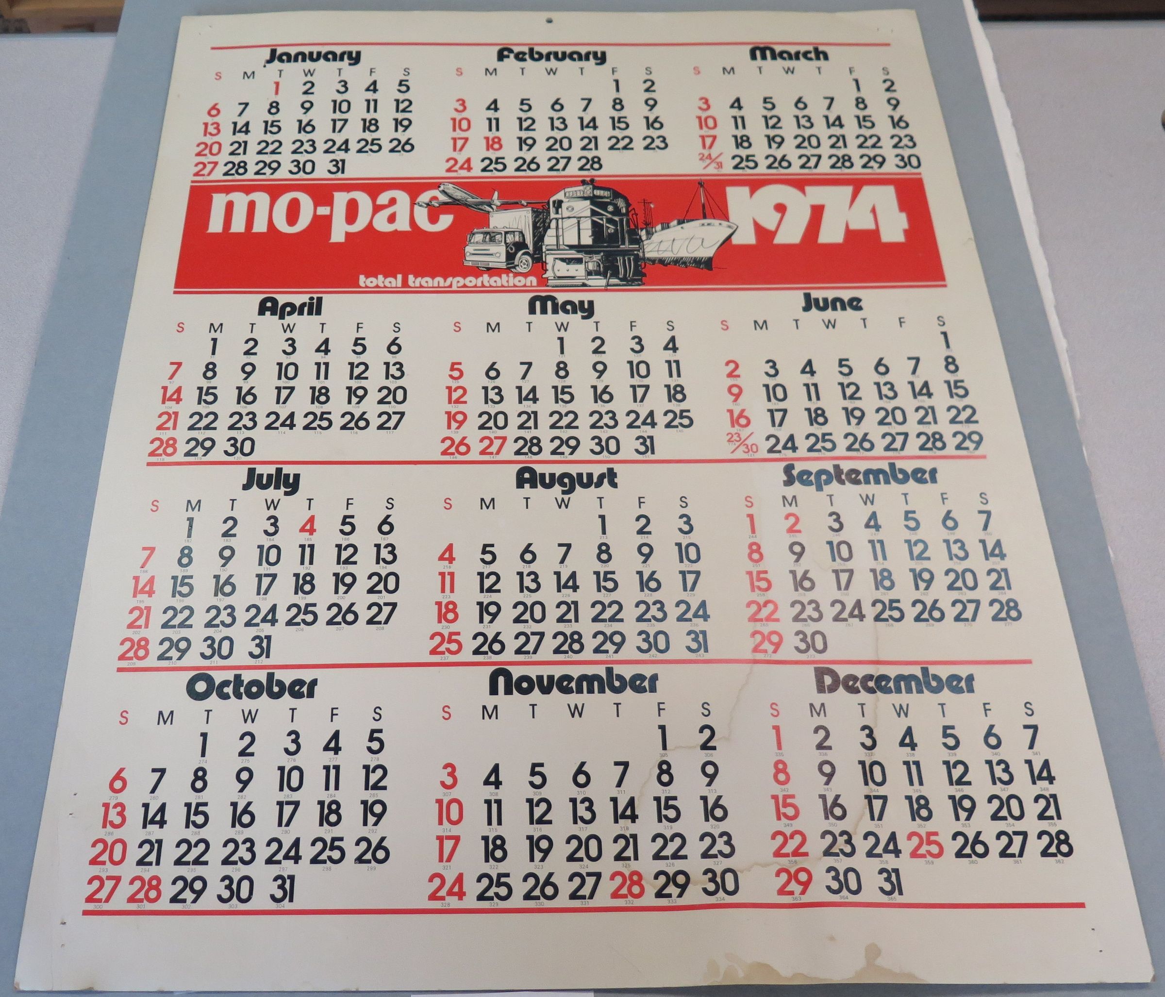 A large calendar, 24" x 31" on poster board, 1974. The calendar was distributed by Mo-pac Total Transportation (Missouri Pacific Railroad). All months are displayed in black text and numbering on the poster, with a large orange banner showing the year, the Mo-pac name, and illustrations of an airplane, a truck, a diesel locomotive/train, and a cargo ship. Holidays are designated with red numbered days, instead of black. The calendar might have been used in the Broomfield Train Depot by the station agent; an inscription in pencil on the back, upper right corner reads, "This was hanging in agent's office when depot was moved."