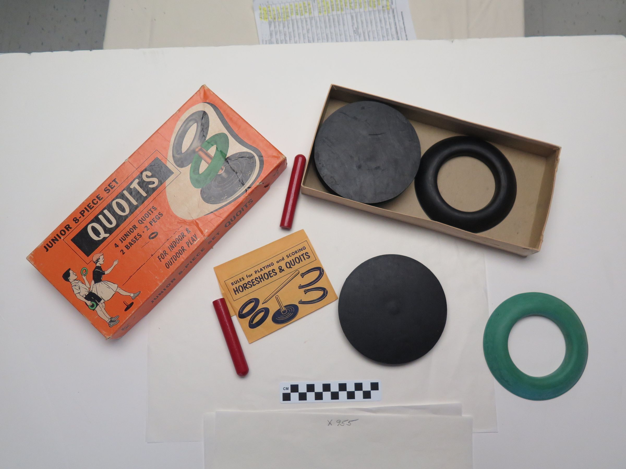 This is a cardboard box for the game Quoits. The game is inside of the box. The box measures 2" (h) x 12" (w) x 5.5" (l).