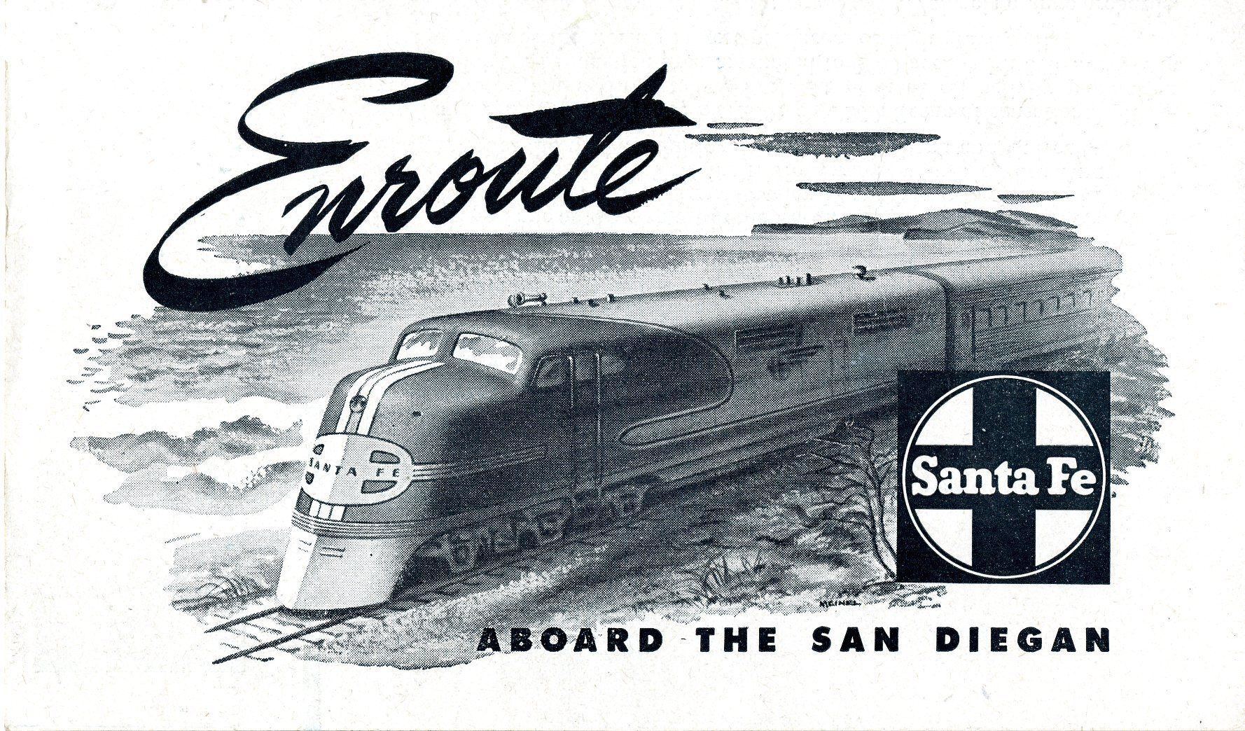 A small brochure train route guide printed by the Atchison, Topeka, and Santa Fe Railway Company, titled "Enroute Aboard the San Diegan," circa 1950. The guide is 3.5" x 6" when folded.6" x 10" unfolded. The front, when folded, has a pencil illustration of a Santa Fe train going through a desert/flat landscape, with the Santa Fe cross logo near the lower right corner.