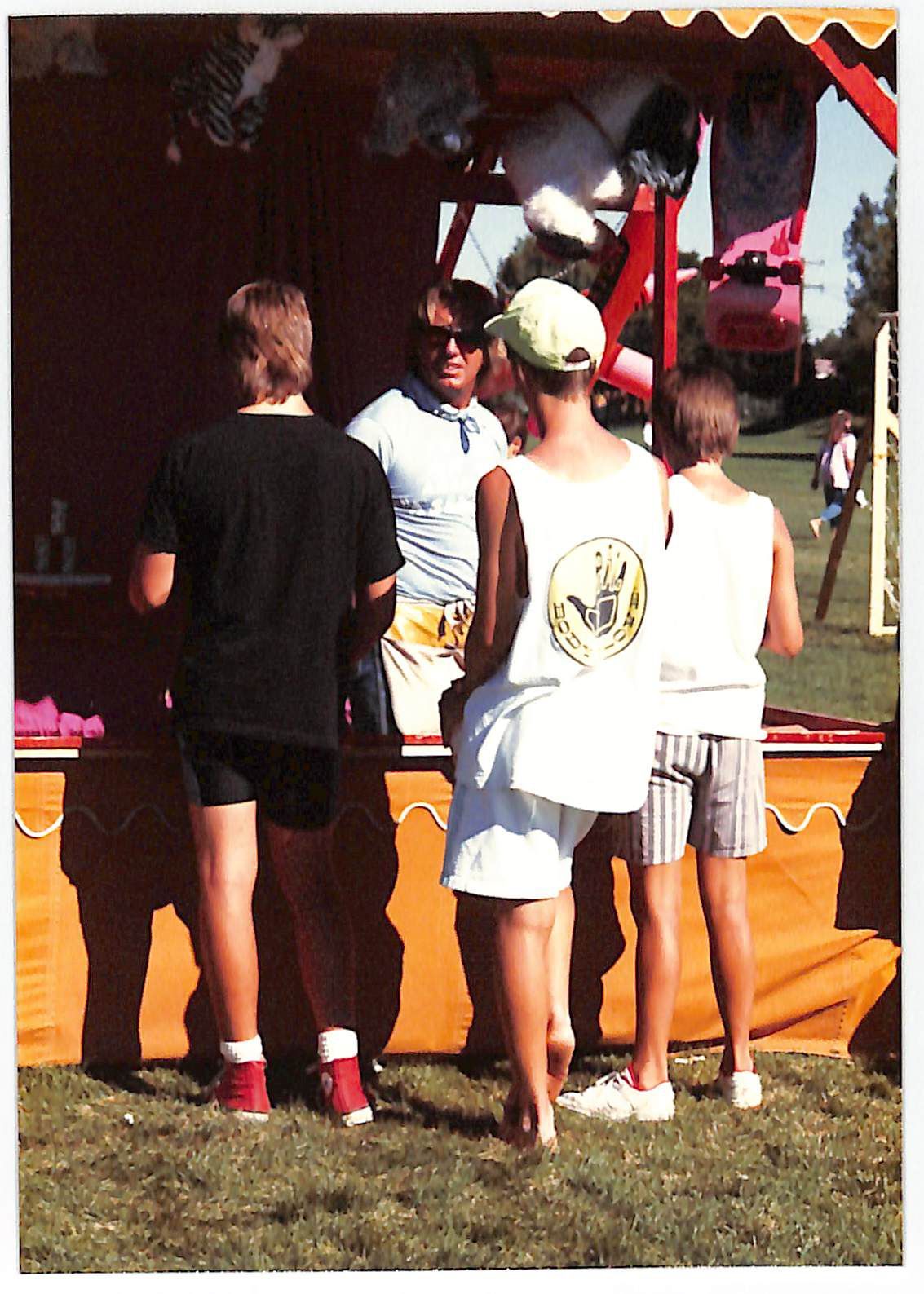 Item is a photograph printed on Kodak paper taken during the 1989 Broomfield Days event. In the photo, three kids are gathered in front of a yellow booth set up in a grassy field. They are speaking to the man running the booth, who is explaining the carnival game to them. No doubt they hope to win one of the prizes hanging from the booth's tented ceiling. The boy on the left is wearing all black, the one in the middle has a tank top and baseball cap on, and the kid on the right has a tank top and striped shorts on. Trees and houses complete the background.Photograph Details