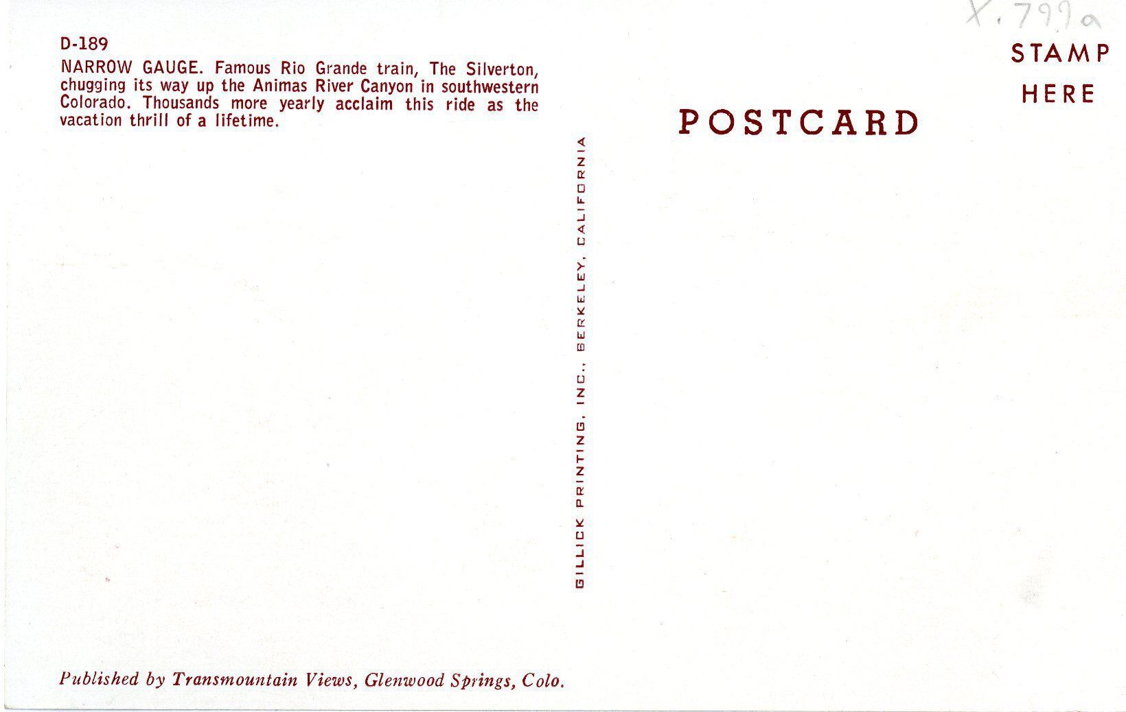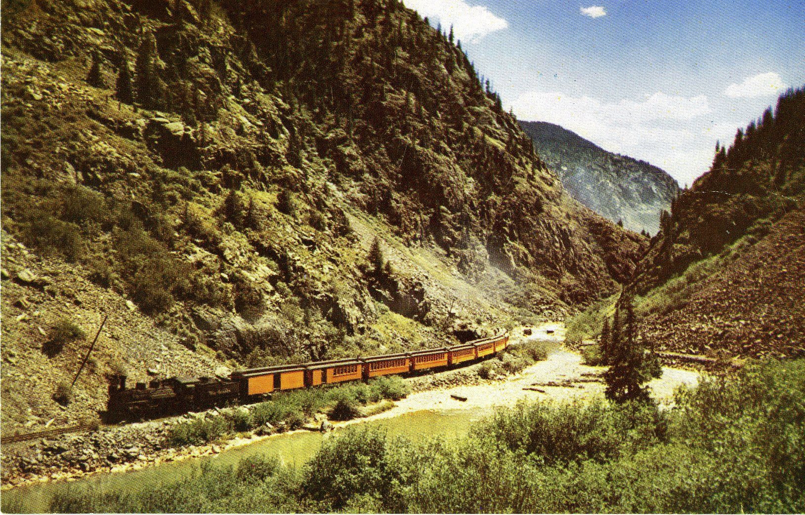 Color, 3.5" x 5.5" postcard depicting a narrow gauge, steam train, undated. The train in the front image is called "The Silverton," traveling in the Animas River Canyon in Southwestern Colorado. The train was a "Rio Grande" train, possibly part of the Denver and Rio Grande Western Railroad Company. The reverse side has been left blank, with a printed description of the image in the upper left corner. The post card was published by Transmountain Views in Glenwood Springs, Colorado. It was printed by Gillick Printing, Inc. in Berkely, California.Collection