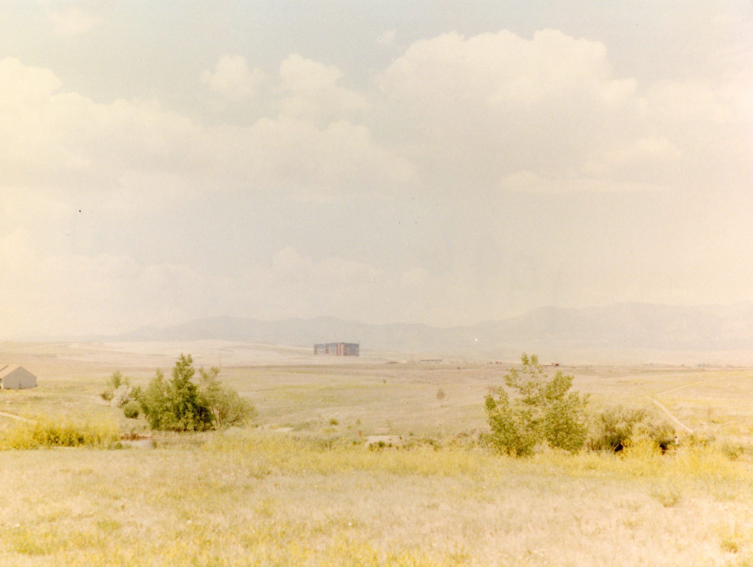 Color photograph of a landscape with a building in the background. Photograph taken facing what is now Interlocken in 1996. Photograph probably taken in the Lac Amora Neighborhood of Broomfield, CO.