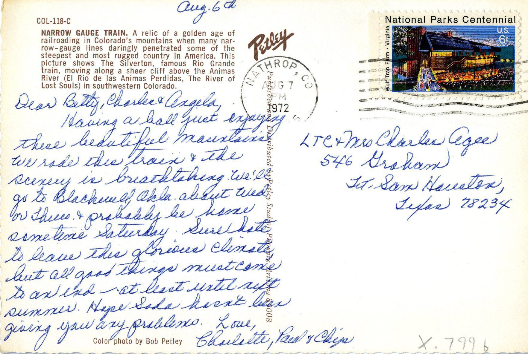 Color, 4" x 6" postcard with a picture of "The Silverton" narrow gauge train on a sheer cliff over the Las Animas River, 1972. The train was probably part of the Denver and Rio Grande Western Railway Company. The reverse side has a printed description of the front image, as well as a National Parks Centennial stamp. The correspondence portion is filled out with writing for LTC and Mrs. Charles Agee, 546 Graham Jct., Sam Houston, Texas 78234. The correspondence highlights a mountain trip.