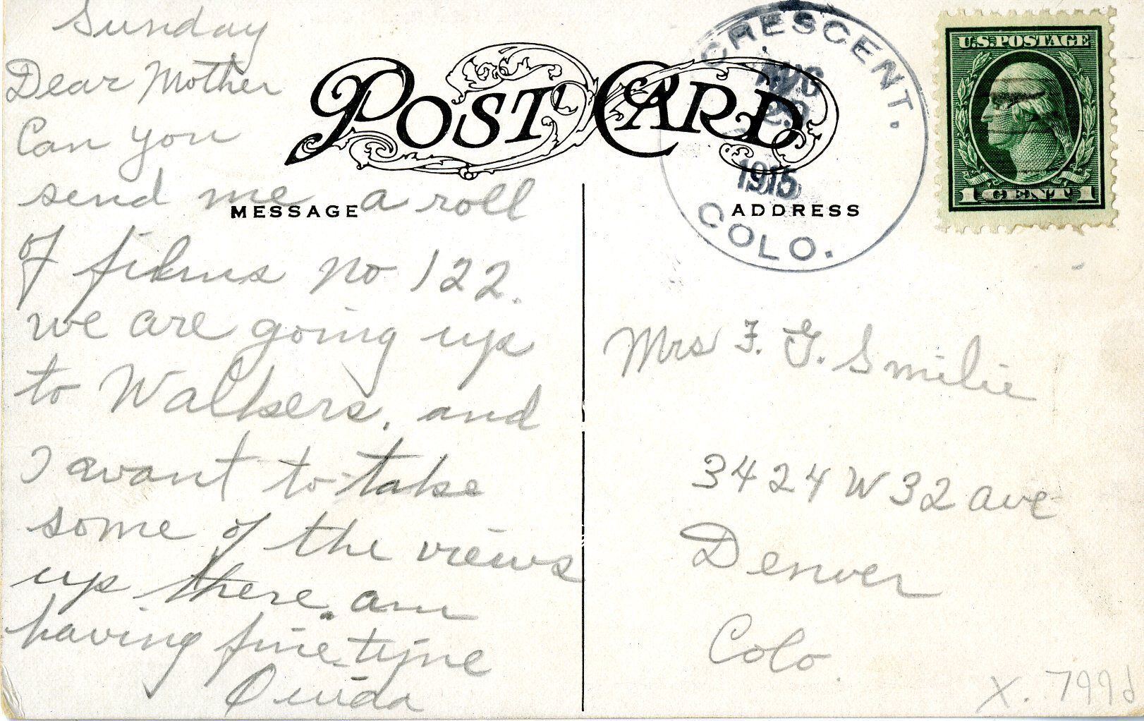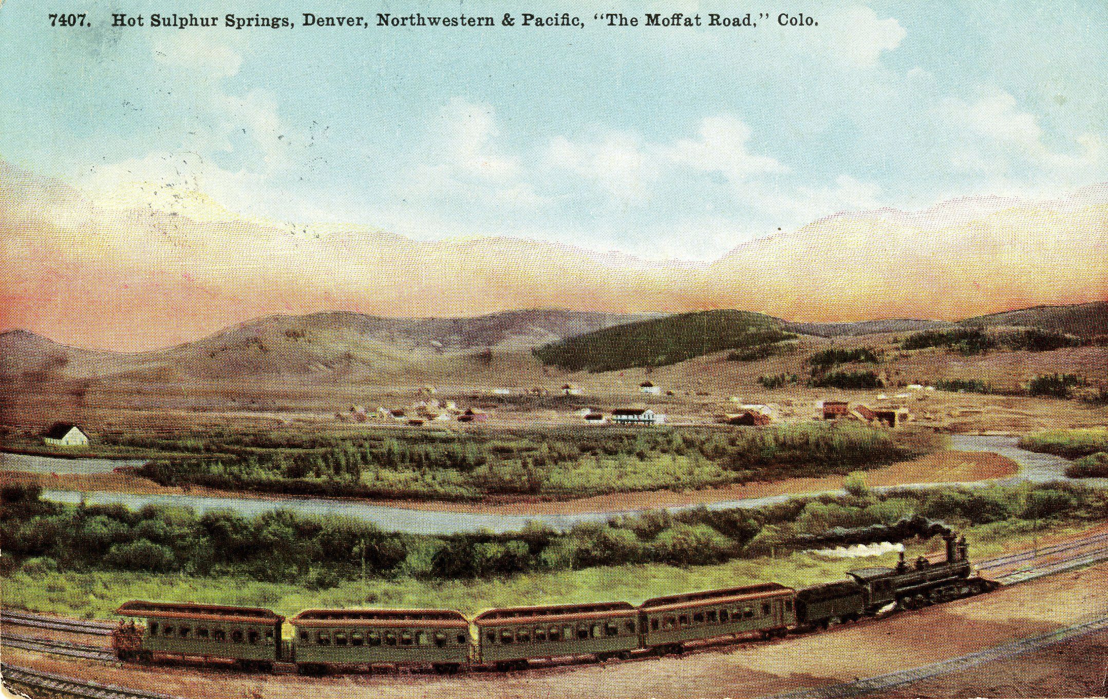 Color, 3.5" x 5.5" postcard depicting a steam locomotive train traveling through a landscape with houses/ranches in the background, 1915. Small text at the top of the postcard labels the scene: "7407. Hot Sulphur Springs, Denver, Northwestern & pacific, 'The Moffat Road,' Colo." The reverse side has a message from a rail traveler, Ouida, to her mother, addressed to Mrs. F.G. Smilie, 3424 W. 32 Ave., Denver, CO. The message asks for number 122 films for a trip.Collection