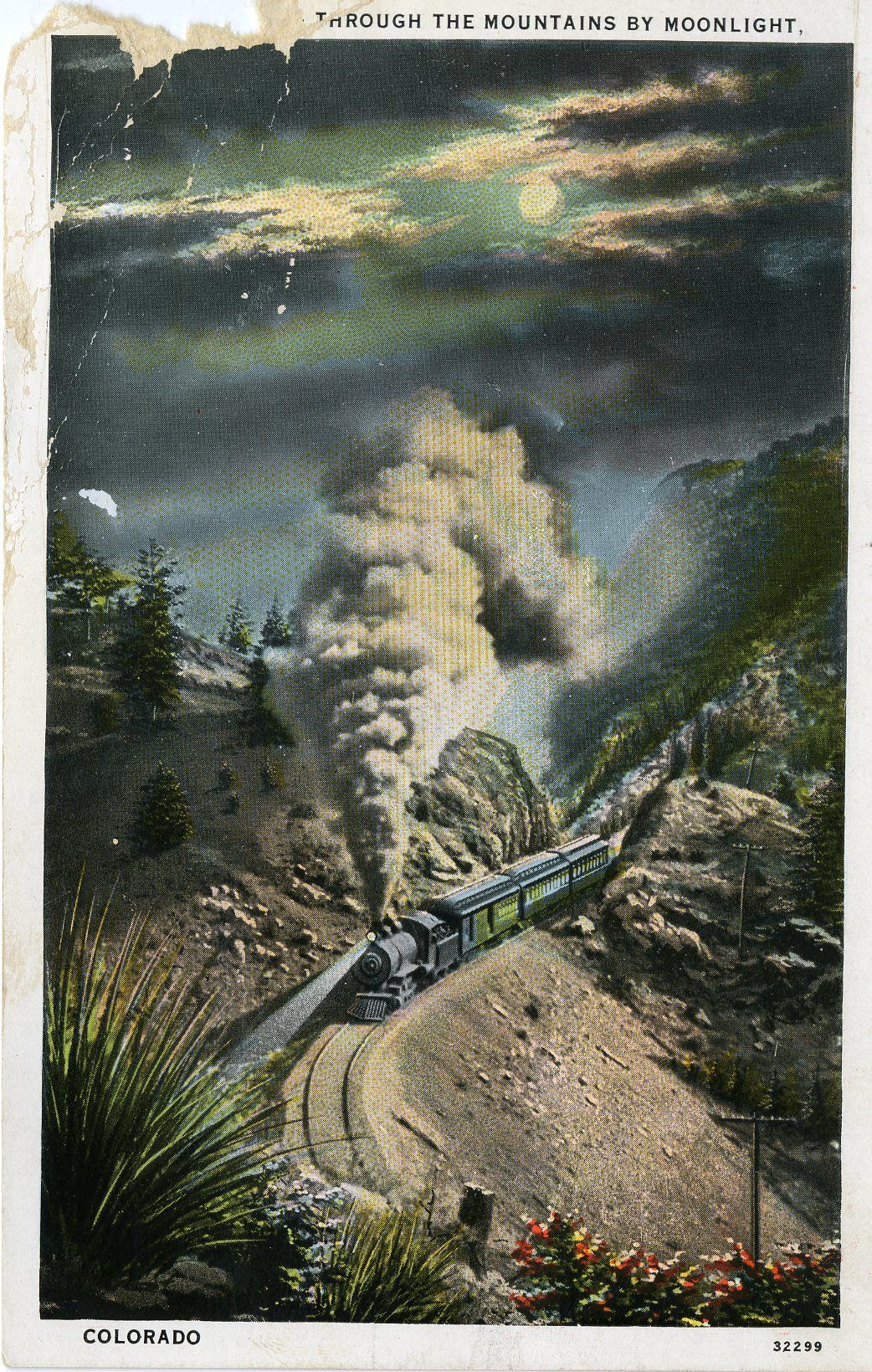 Color, 3.5" x 5.5" postcard depicting a steam locomotive traveling through a mountain landscape at night, undated. A portion of the postcard is ripped off near the upper left corner. Part of the text at the top is missing; it reads "...Through the Mountains by Moonlight." At the bottom edge, the text "Colorado" and "32299" is printed.