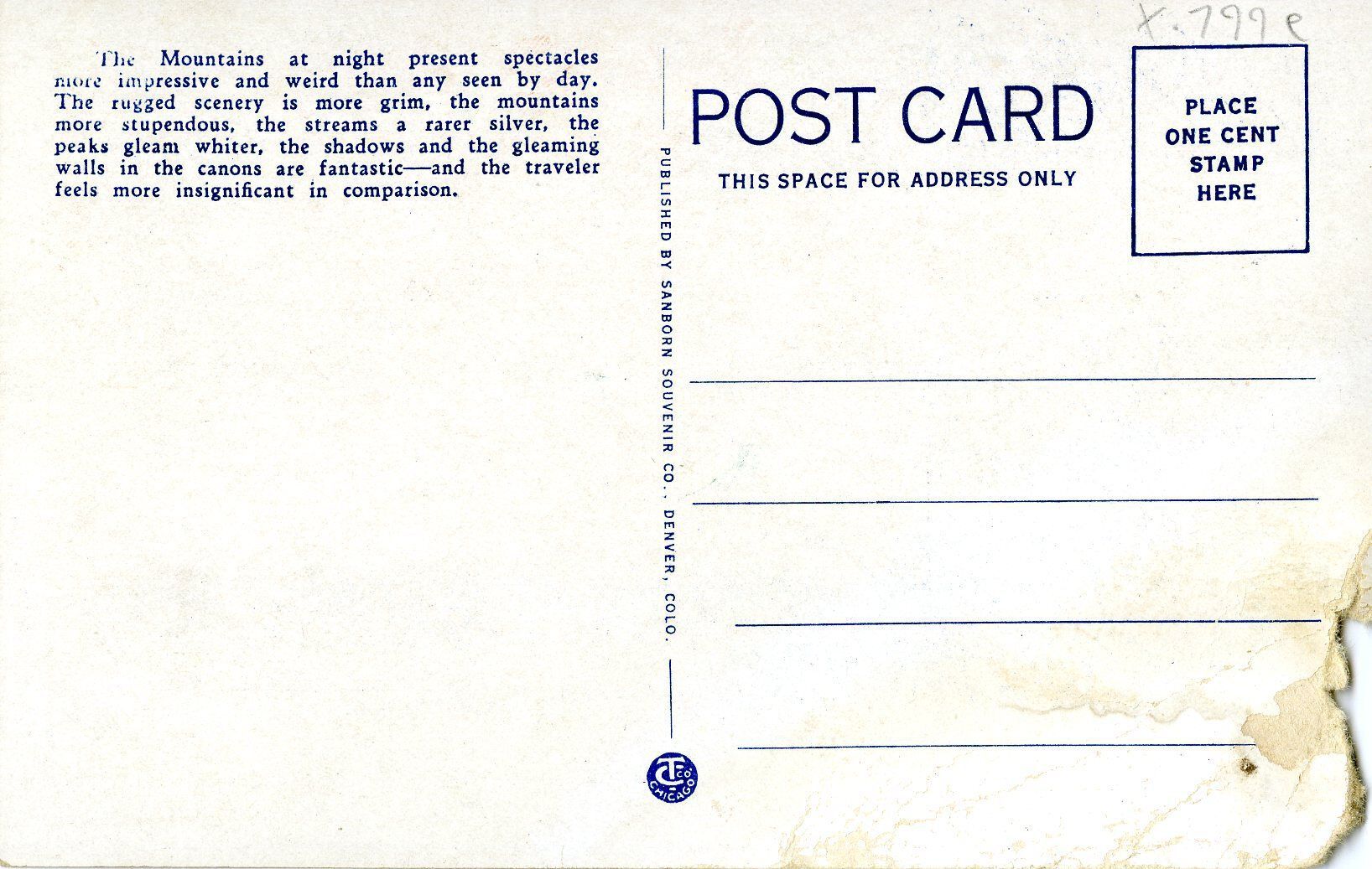 The reverse side has a printed description of the front image. The correspondence, address, and stamp portions are blank. The postcard was published by Sanborn Souvenir Company, Denver, Colorado. The postcard may have originally been part of a set.Collection