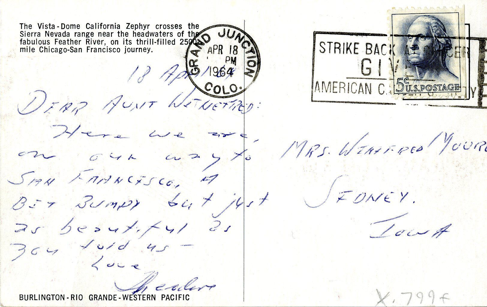 The reverse side has a printed description of the front picture, a date stamp from the post office at Grand Junction, and a message written to a Mrs. Winfred Moore of Sidney, Iowa from her nephew, Theodore, concerning his trip to San Francisco by train. A George Washington postage stamp is used. "Burlington - Rio Grande - Western Pacific" is printed at the bottom.Collection