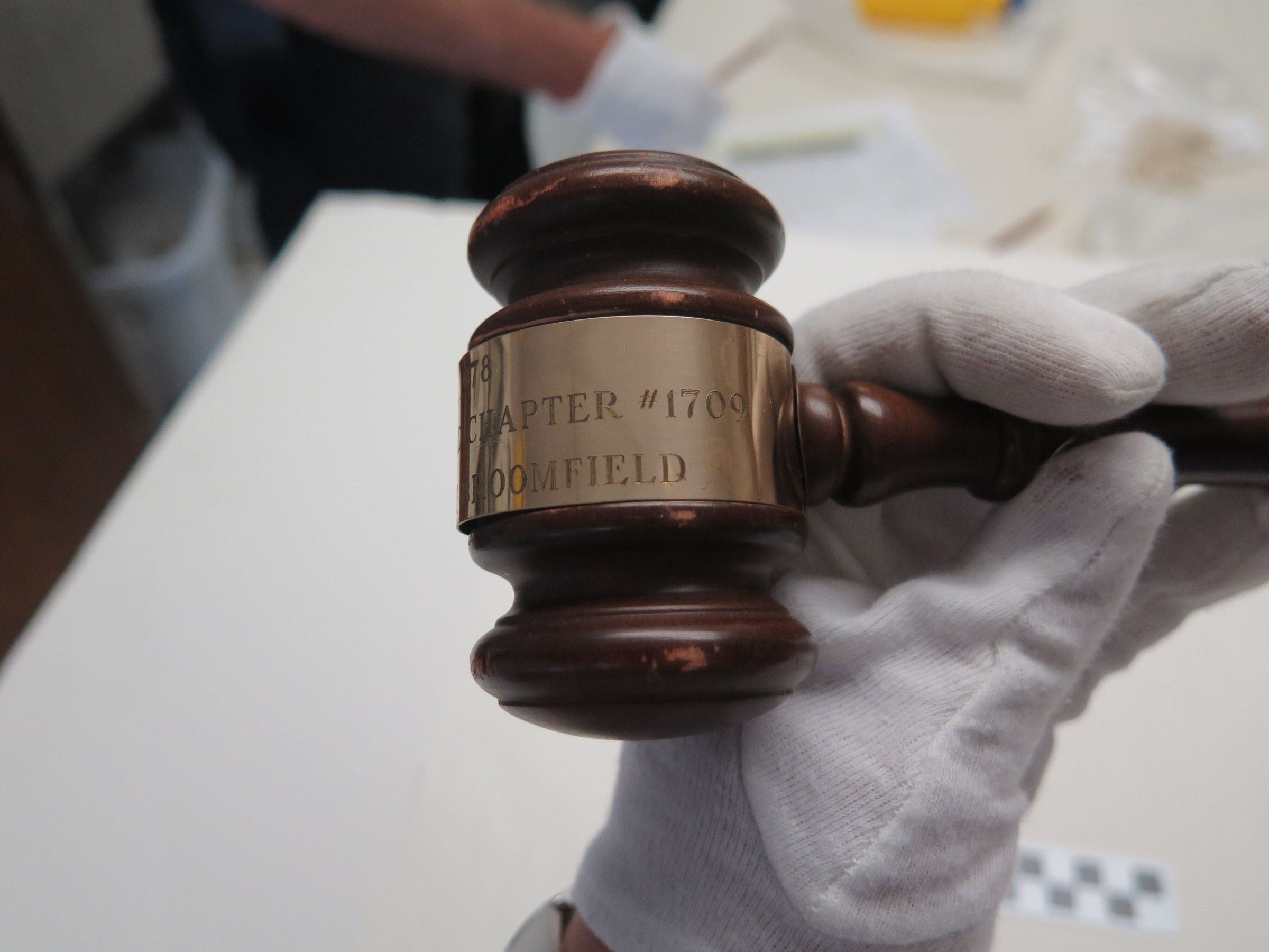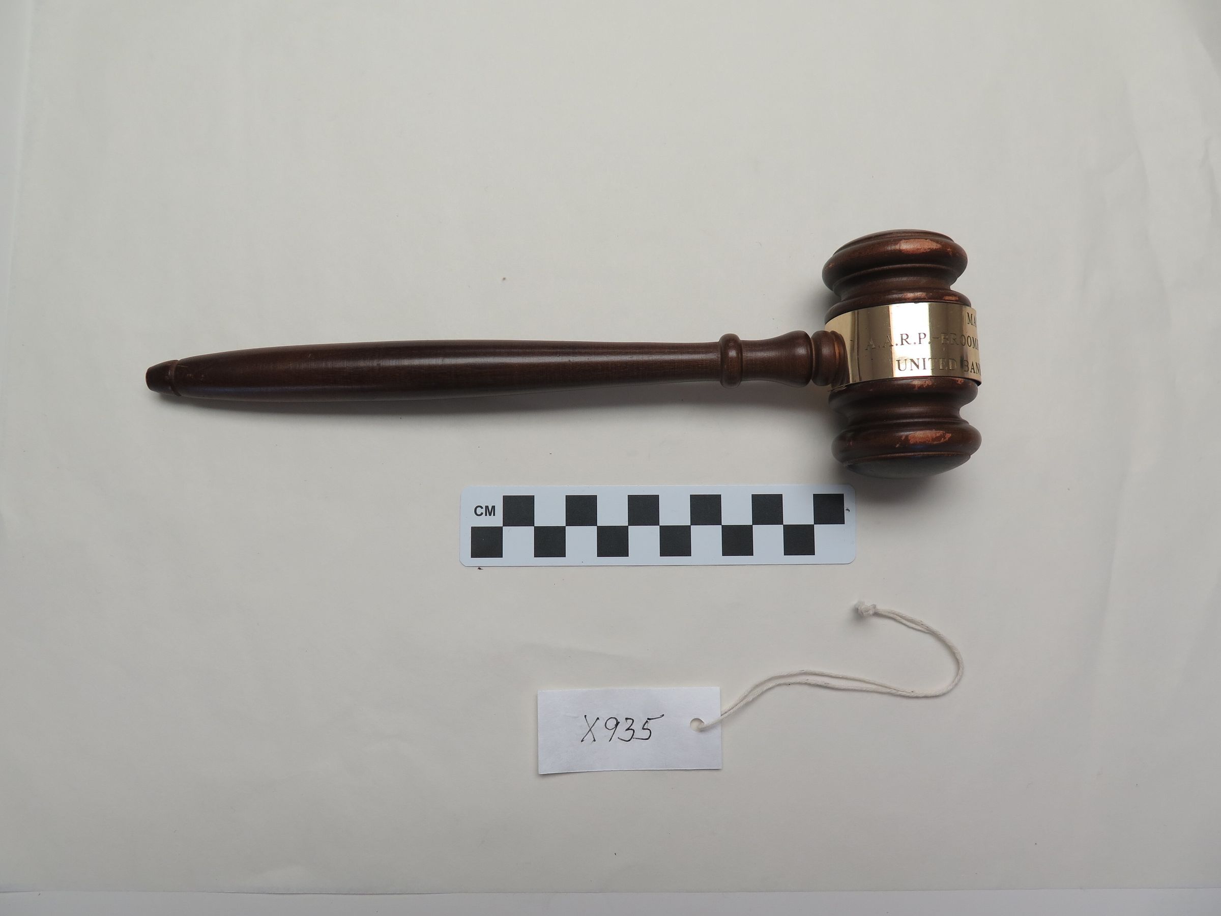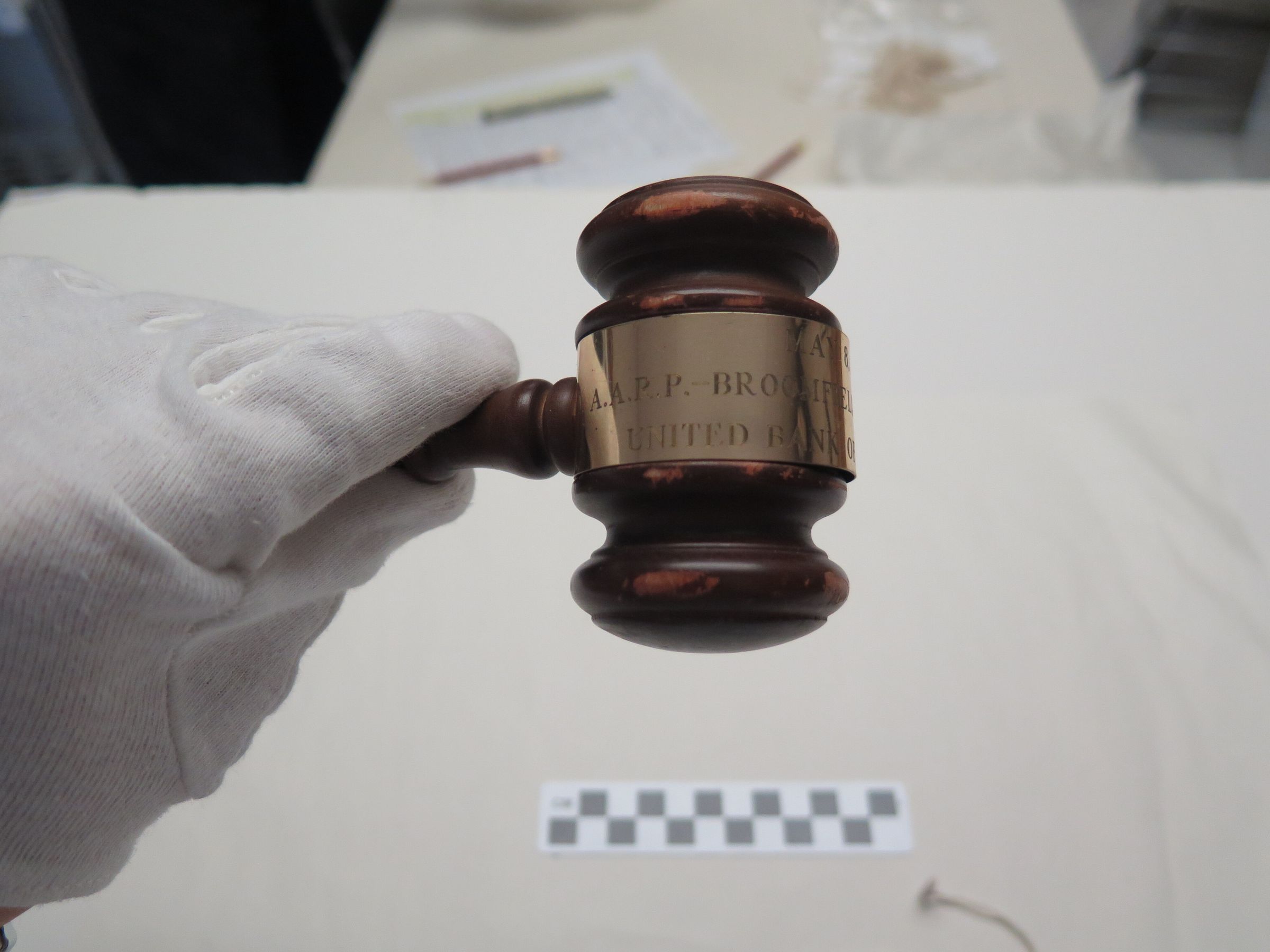 This is a wood gavel from a Broomfield chapter of the AARP. The gavel measures 2.5" (w) x 10" (l) x 2" (dia).