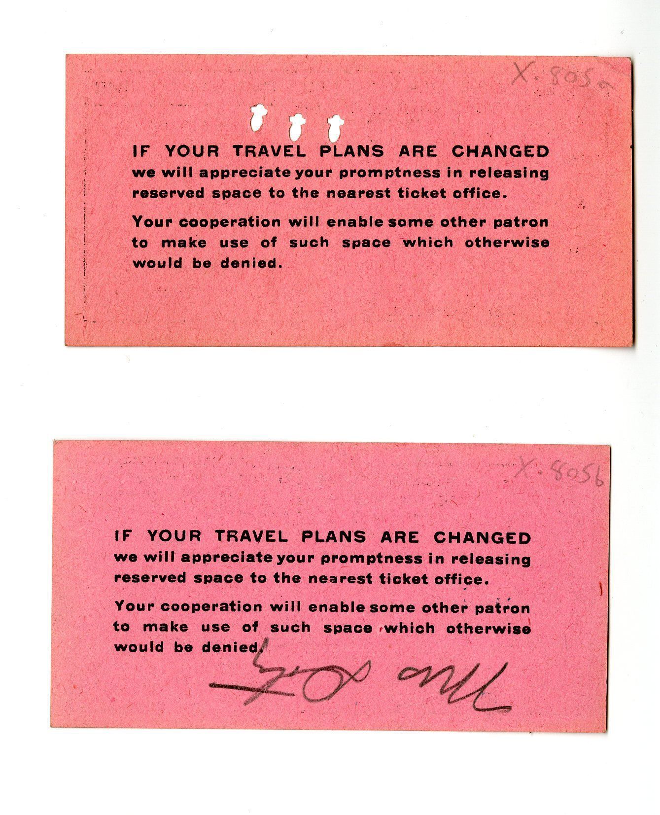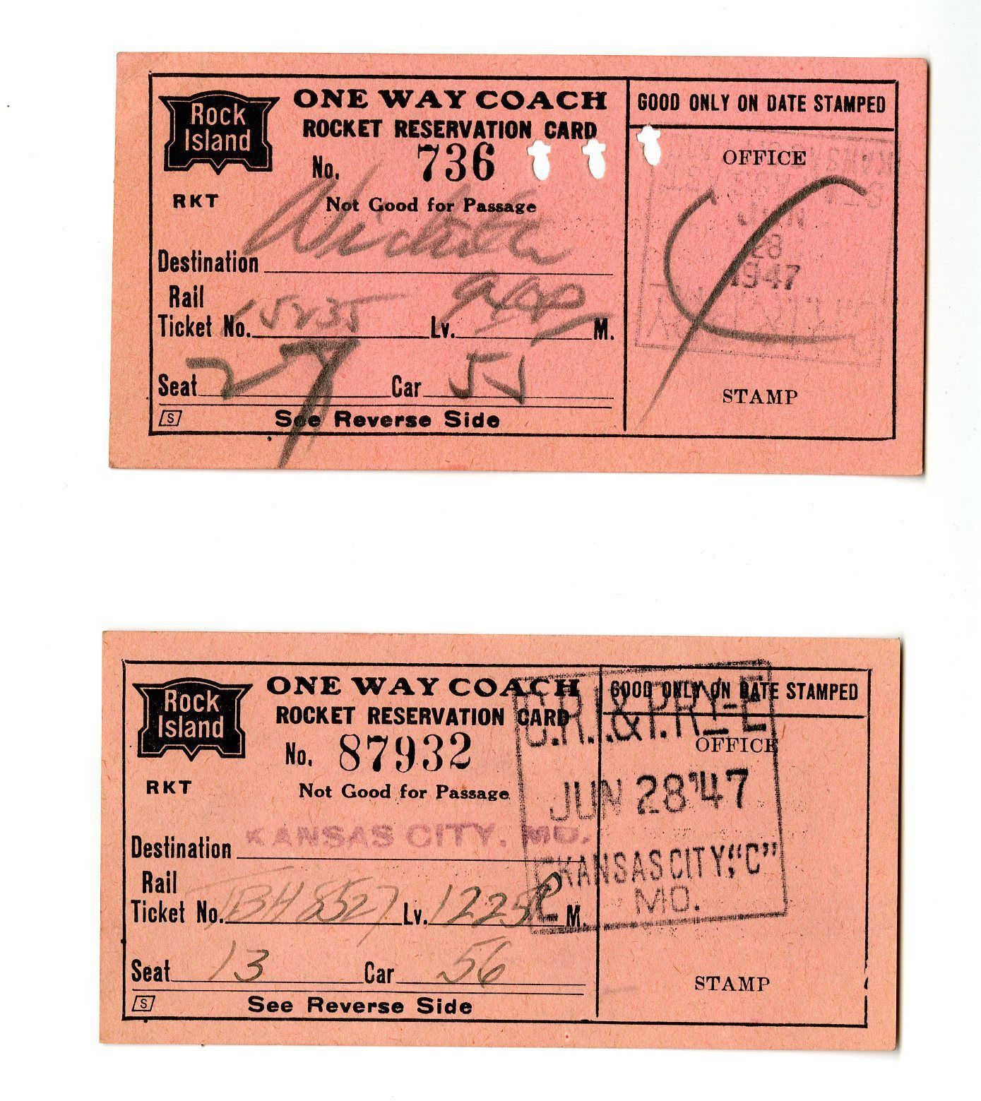 Two tickets for a one way coach trip with the Chicago, Rock Island and Pacific Railway, June 28, 1947. Each ticket is on pink card paper, 2" x 3.5". One ticket is numbered 736, destination Wichita, Rail Ticket number 15235. The level, seat, and car are filled in with illegible writing in pencil. Three hole punches with a design shape are next to the ticket number, and the office stamp space is stamped with the date. The reverse side of the ticket notifies the passenger to contact the railway in the event of a trip cancellation, to free up train space.