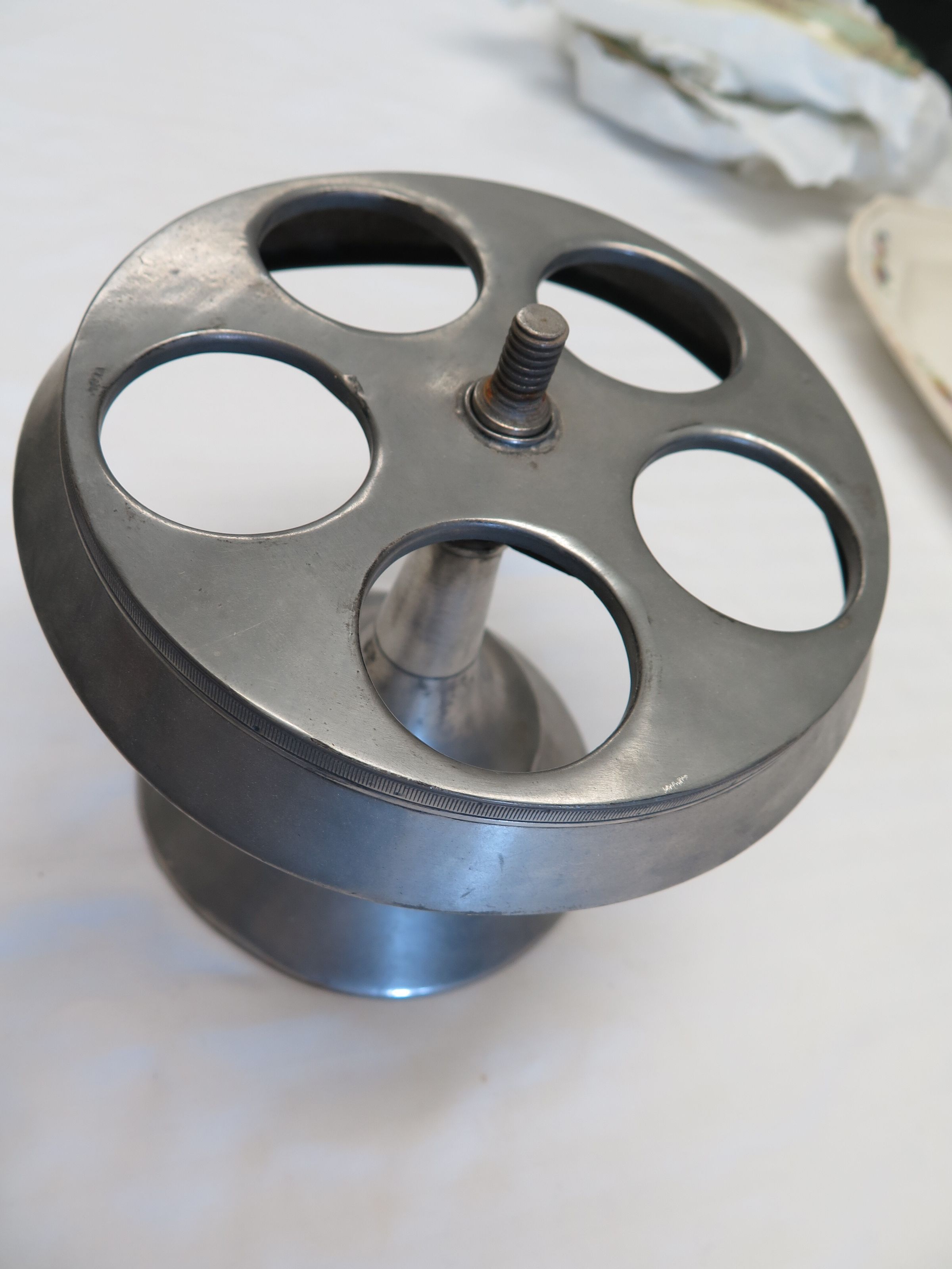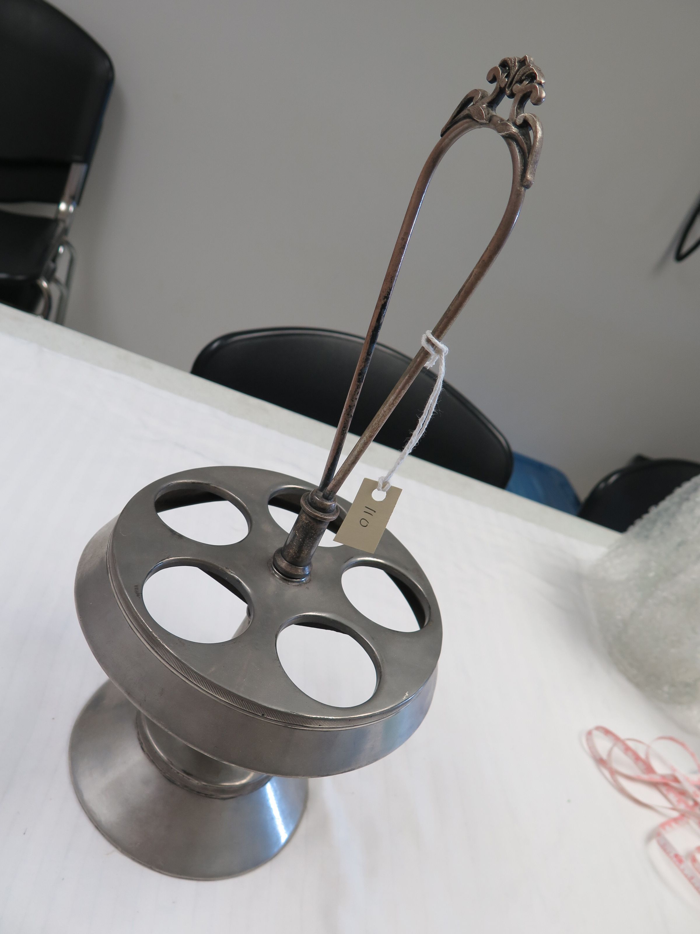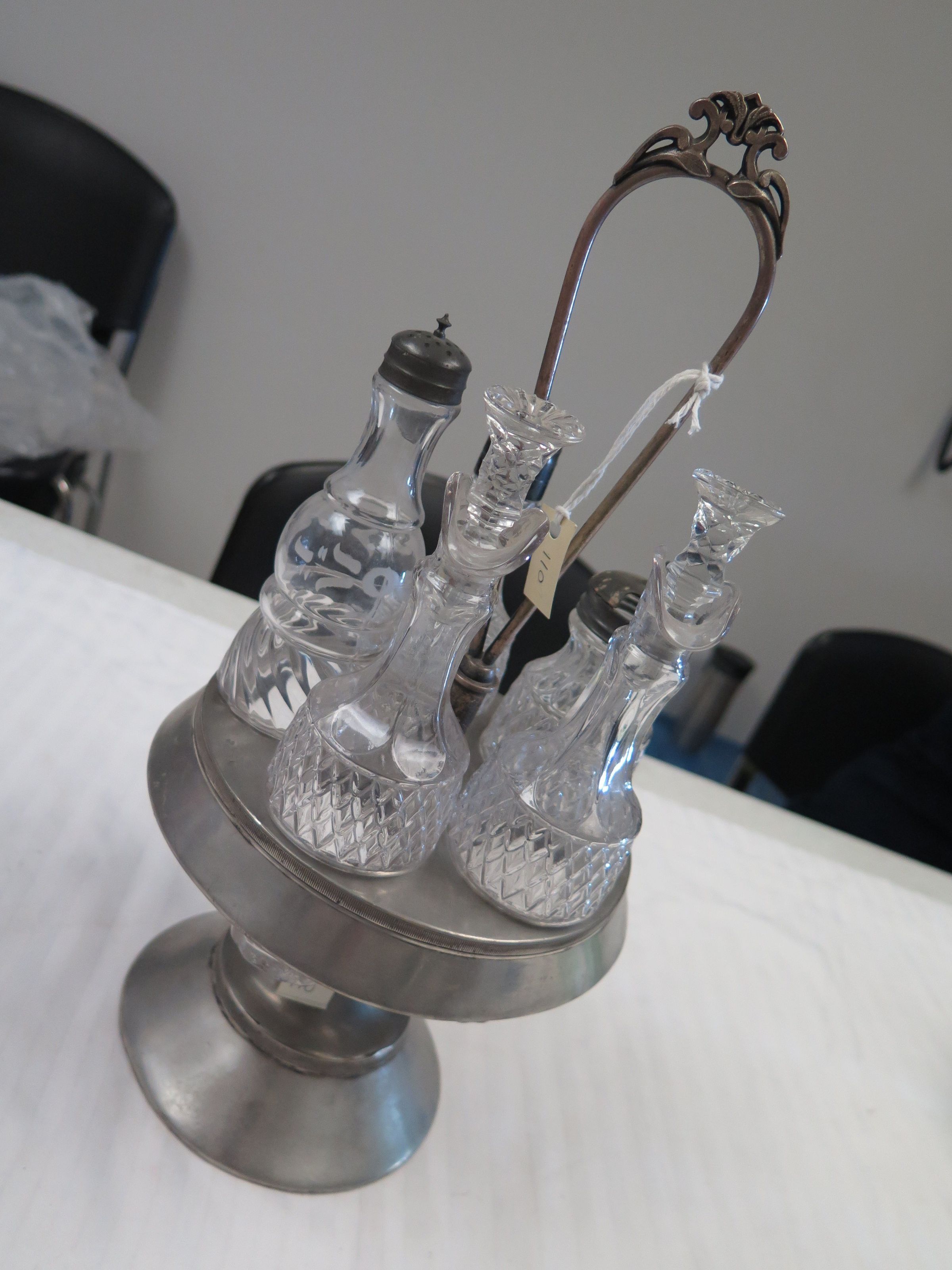 This is a silver metal condiment holder that breaks into 3 parts, including a handle. Included is also 5 glass condiment containers. The condiment holder or lazy susan- measures 15" (h) x 6.5" (dia). The glass condiment containers (5) each measure 8" (h) x 2" (dia).