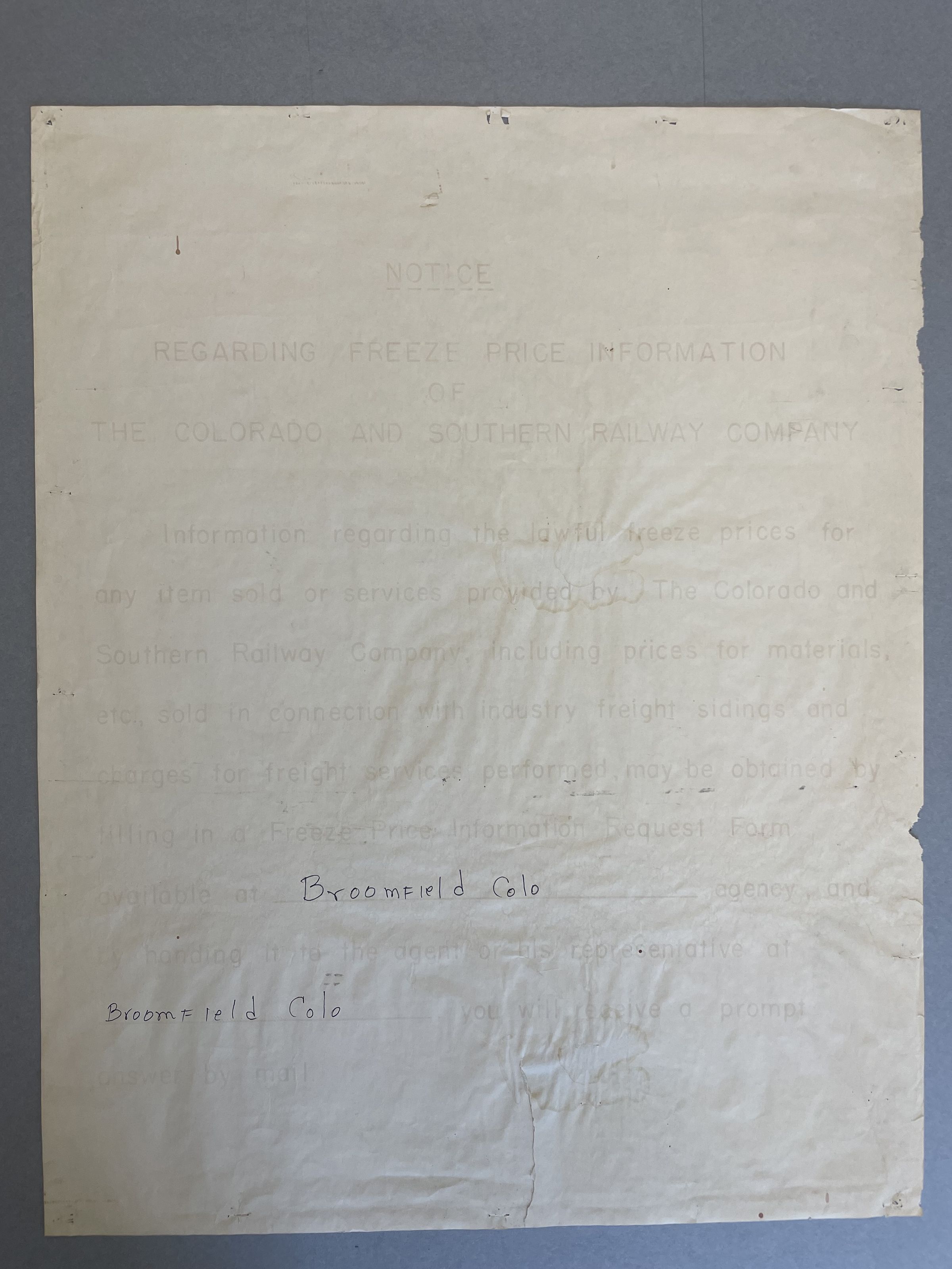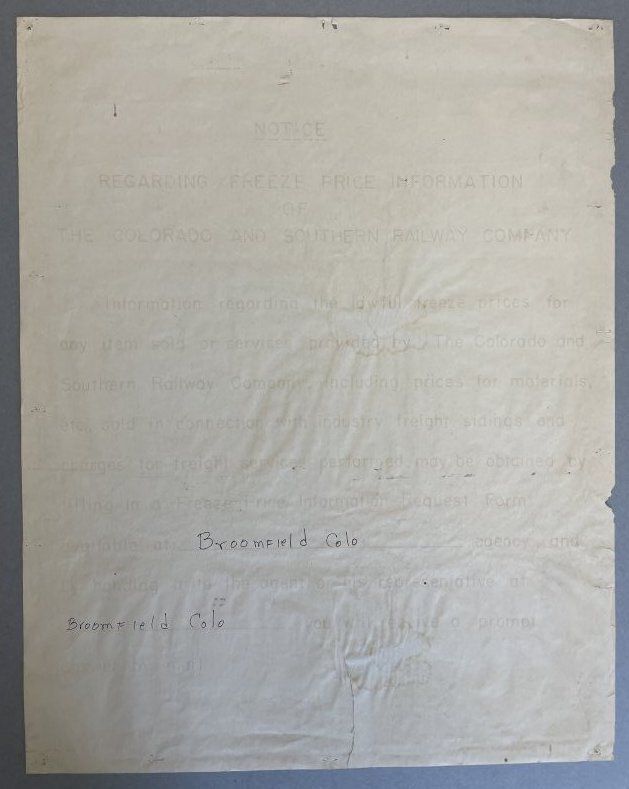 "Information regarding the lawful freeze prices for any item sold or services provided by The Colorado and Southern Railway Company, including prices for materials etc. sold in connection with industry freight sidings and charges for freight services performed, may be obtained by filling in a Freeze Price Information Request Form available at Broomfield Colo agency, and handing it to the agent or his representative at Broomfield Colo, you will receive a prompt answer by mail."