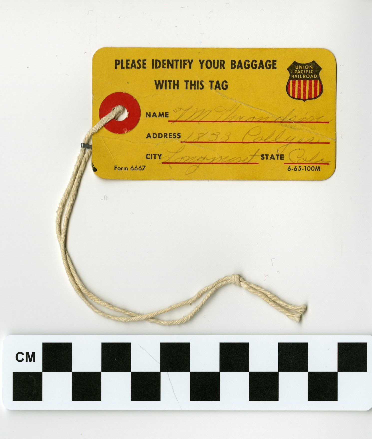 A used baggage tag for the Union Pacific Railroad, circa 1965. The tag is 1.75" x 3.25", card stock. The tag is yellow, with a hole punch and attached string tied in a knot at the end. A small metal fastener is on the string. The hole also has a red ring sticker around it, labeled "Dennison Mfg. Co U.S.A. GC" in printed lettering on one side. One side of the tag has the text, "Dependably Better for Freight Comfortably Better for You" in red at the top and bottom edges of the tag. The text "Union Pacific Railroad" in black is in the center left, with a drawing of a Union Pacific diesel locomotive. The other side of the tag has the text "Please Identify Your Baggage With This Tag" in black at the top edge. The red, white, and blue Union Pacific Railroad shield logo is shown in the upper right corner of the tag. Fields for Name, Address, and City are on the tag. The name has "TM Thurndoise [sic]", in pencil. The address is filled in as 1833 Collyers. The city is Longmont, with the state as "Colo", Colorado. The form number is 6667, shown in the bottom left corner. Another number, 6-65-100M is in the lower right corner.Collection