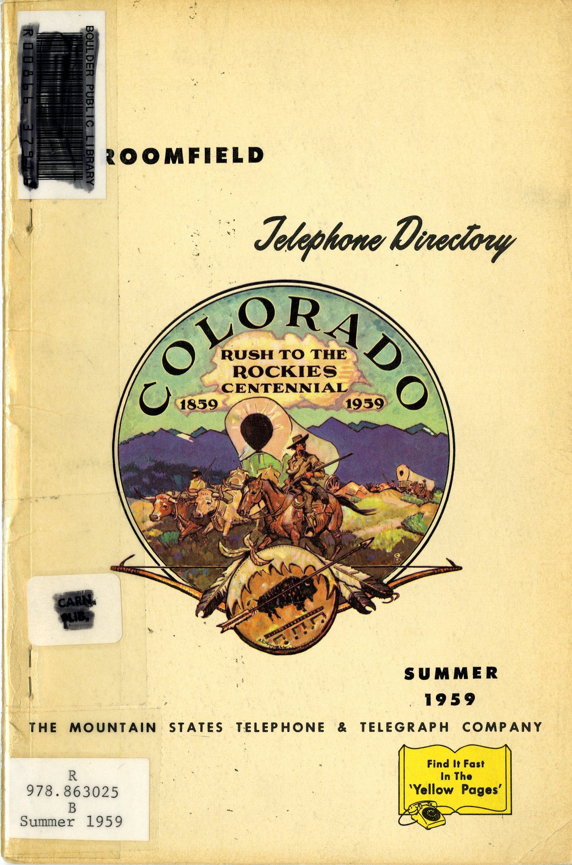 A phonebook for Broomfield, Colorado, Summer 1959. The phonebook was published by the Mountain States Telephone & Telegraph Company, and includes a telephone directory for Broomfield, Broomfield Heights, and East Lake residents and businesses. The book also contains advertisements for different businesses.
