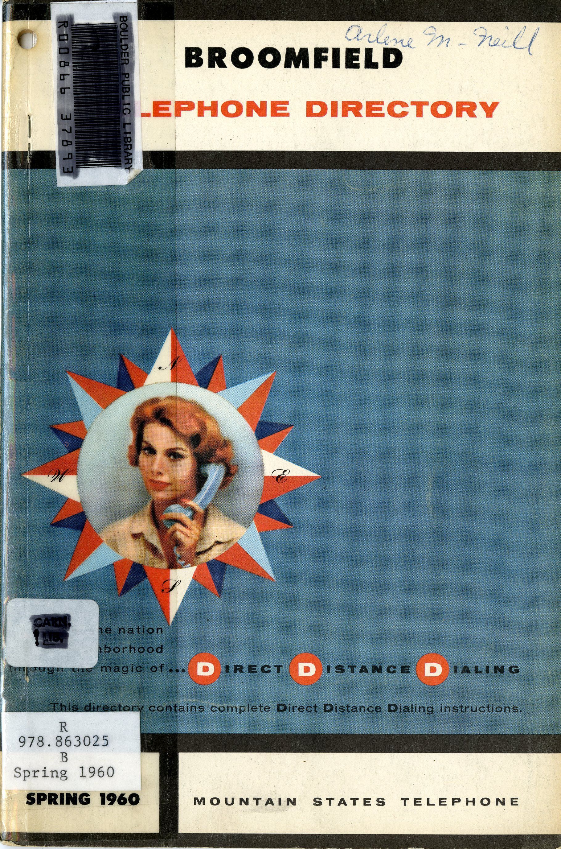 Physical Characteristics: The book is 6" x 9," paper with staple binding. The cover is blue, with a picture of a woman on the phone within a compass pattern to the left. Text pertaining to Direct Distance Dialing is below the picture, with "Broomfield Telephone Directory" displayed at the top of the cover, "Mountain States Telephone" at the bottom. "Arlene M. Neill" is written in ink at the top. The back cover has several color pictures and captions for women talking on the telephone, and a house.Collection