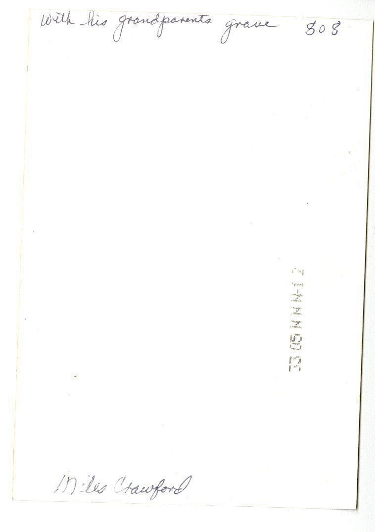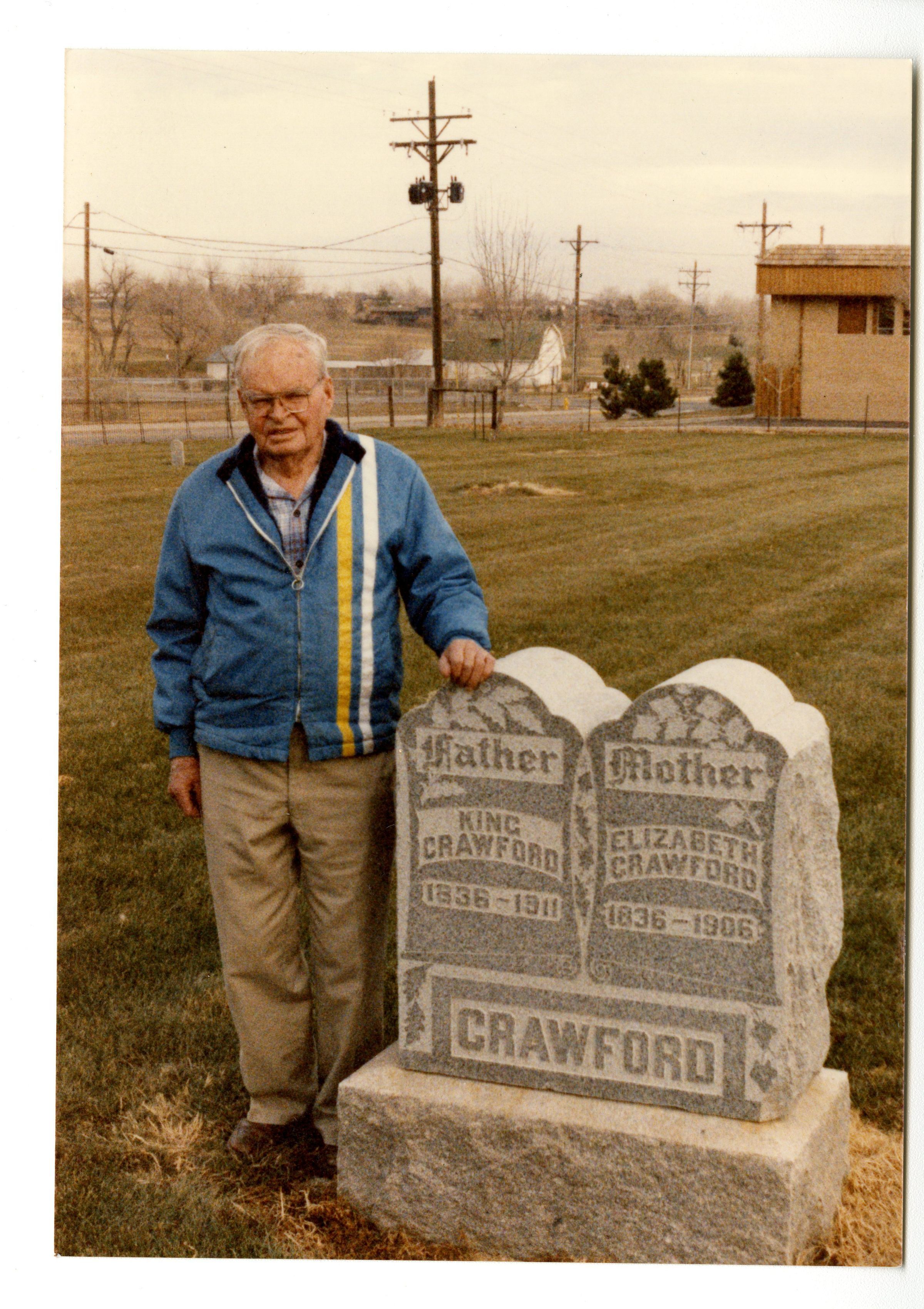 Miles Crawford with his grandparent's grave at Lakeview Cemetery. View of Main Street on left side.