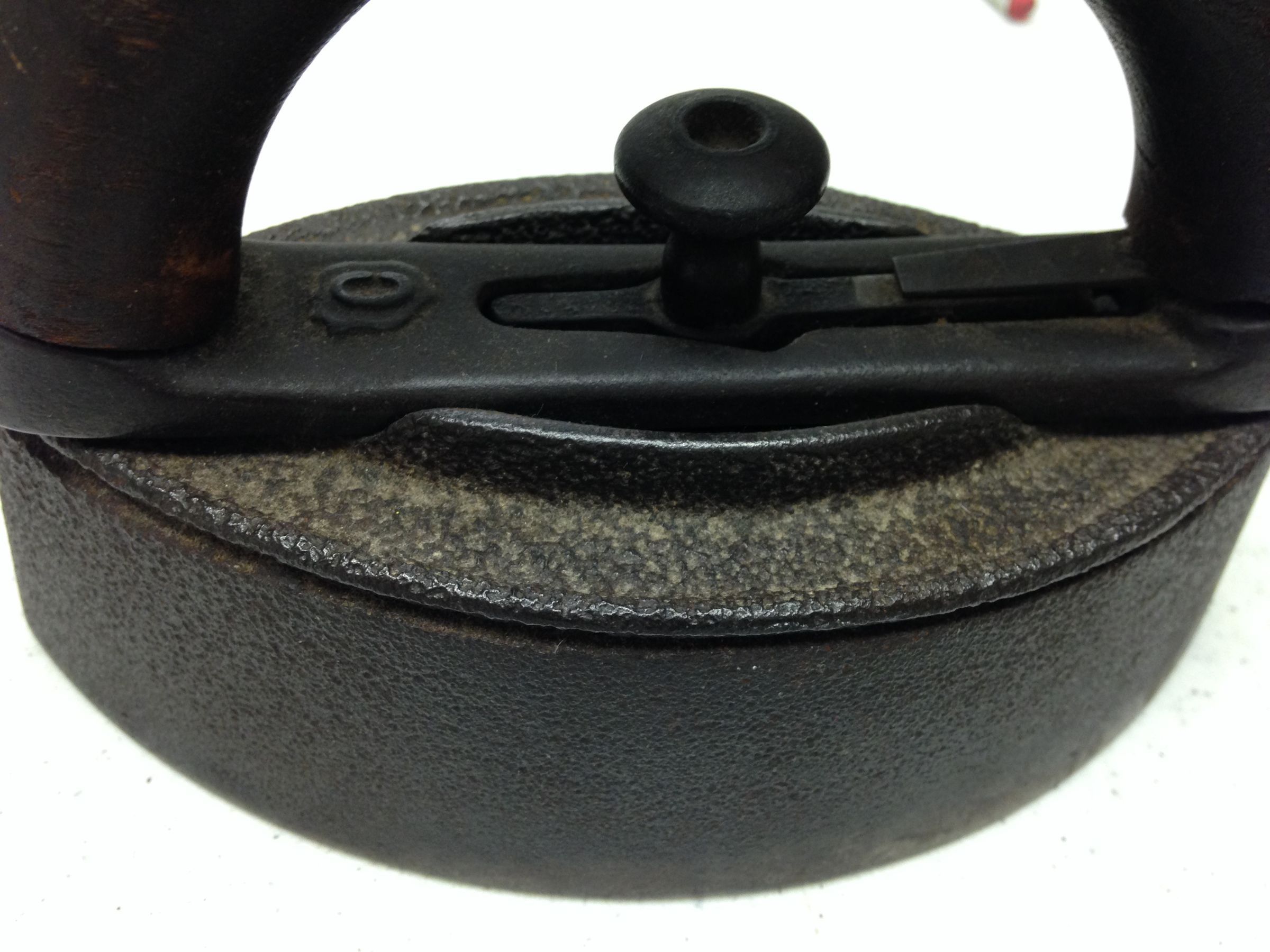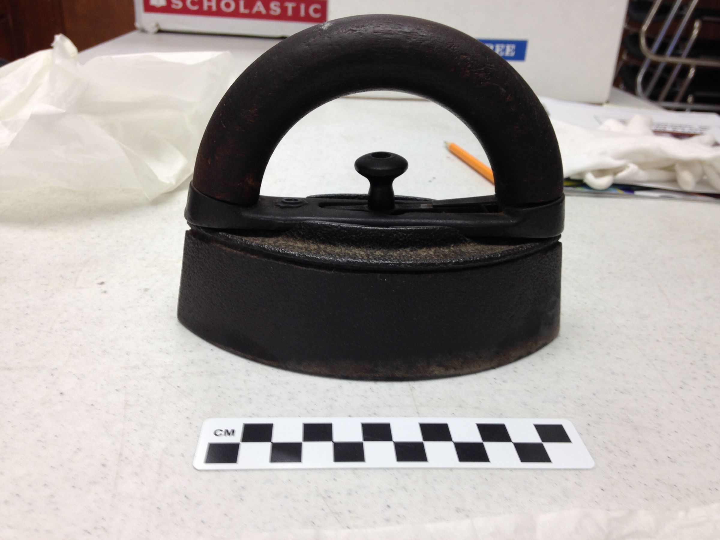 This is a metal iron with a wood handle. The iron measures 5.25" (h) x 3" (w) x 7" (l).