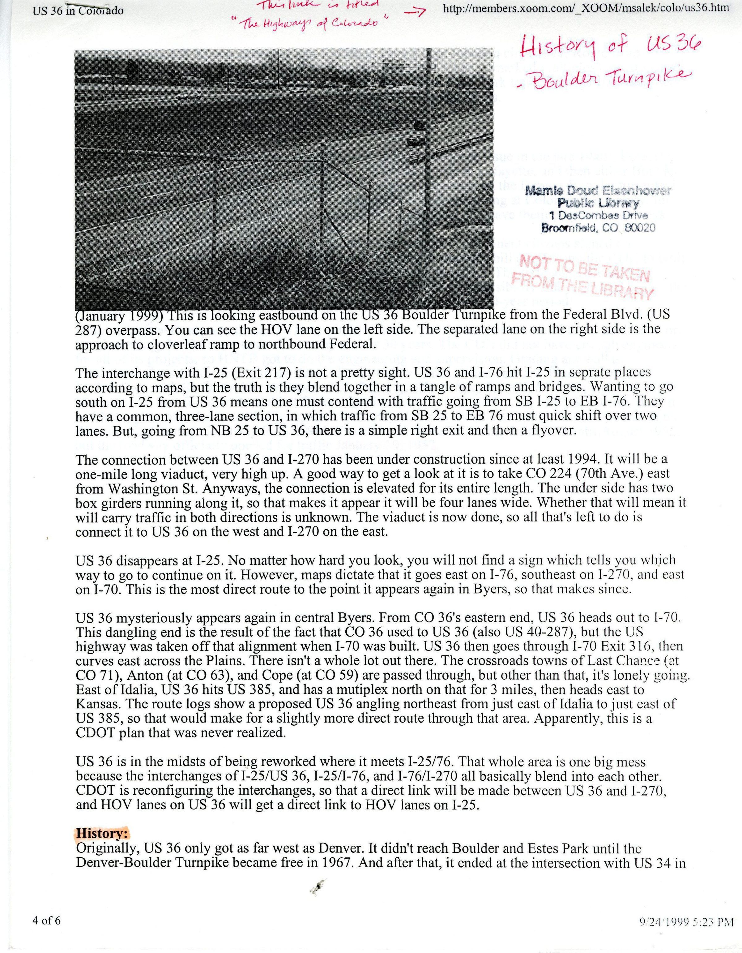 Online article about the history of US 36. Printed from a website titled "The Highways of Colorado." Most of the focus is on the eastern part where US 36 intersects with I-25 and I-270.Collection