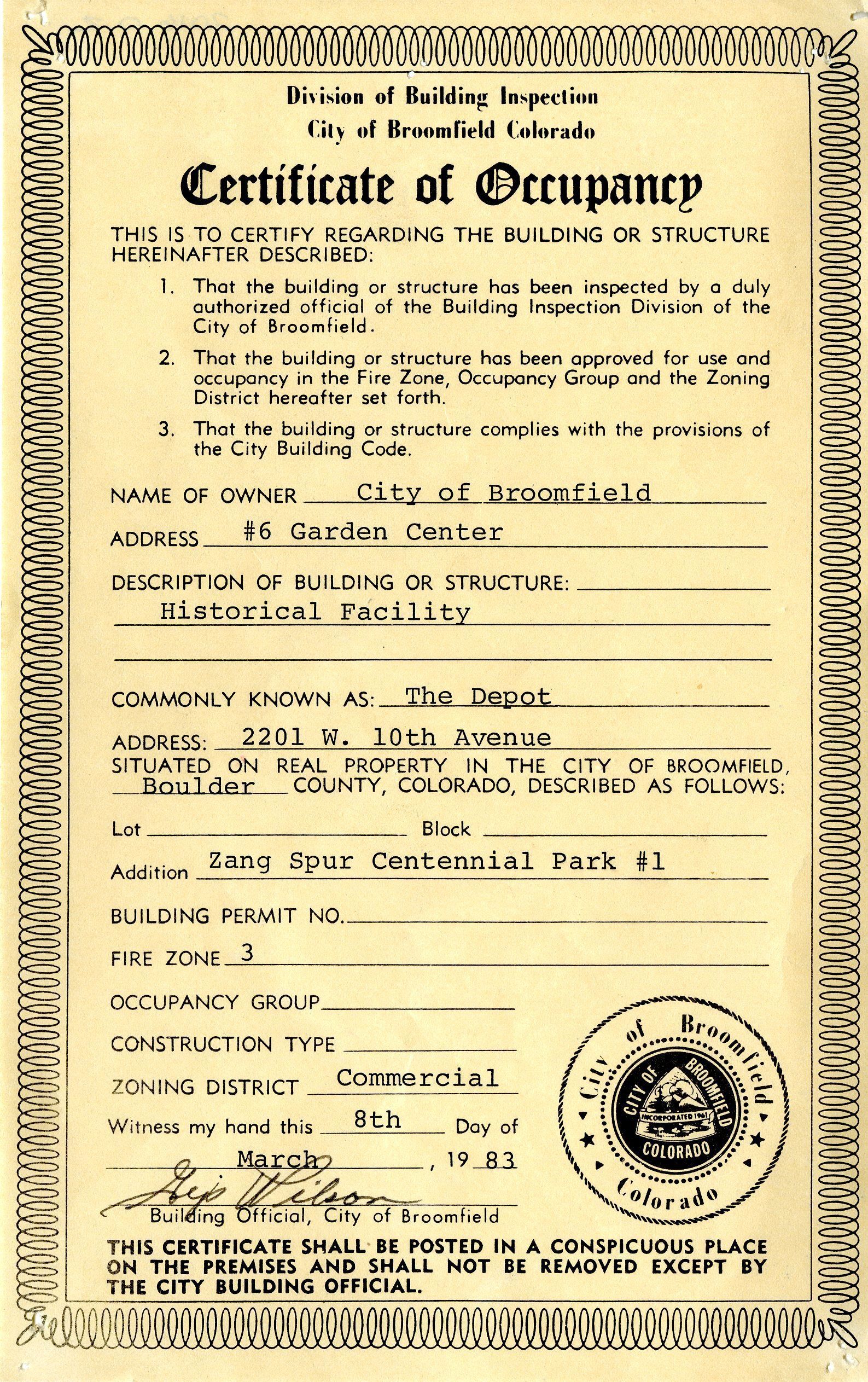The Certificate of Occupancy for the Broomfield train depot, 1983. The certificate is 5.25" x 8.5," paper. It was printed and prepared by the Division of Building Inspection for the City of Broomfield, Colorado. The certirficate shows that the depot was approved for use according to official building inspections, zoning laws, and buidling code provisions. The City of Broomfield is listed as the owner, address #6 Garden Center. The building description is listed as "Historical Facility," with a "Commonly Known As" field listed as "The Depot." The depot's address is for its second location at 2201 W. 10th Avenue, as part of Boulder County, near Zang Spur Centennial Park #1. The zoning district is listed as Commercial. Dated March 8, 1983, it is signed by Building Official Gep Wilson, and includes the seal of the City of Broomfield in the lower right corner.Collection