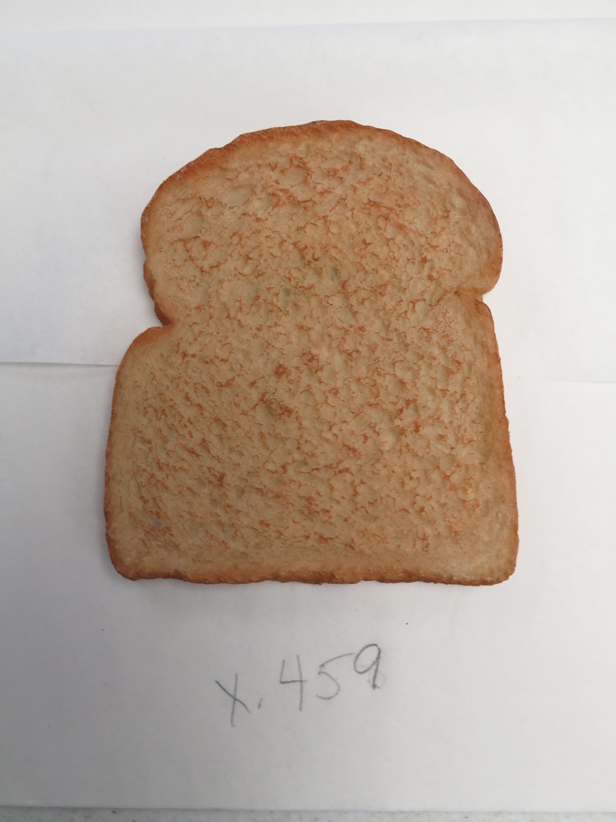 This is a lastic prop piece of bread. The bread measures 0.5" (h) x 5"(w) x 4.5" (l).