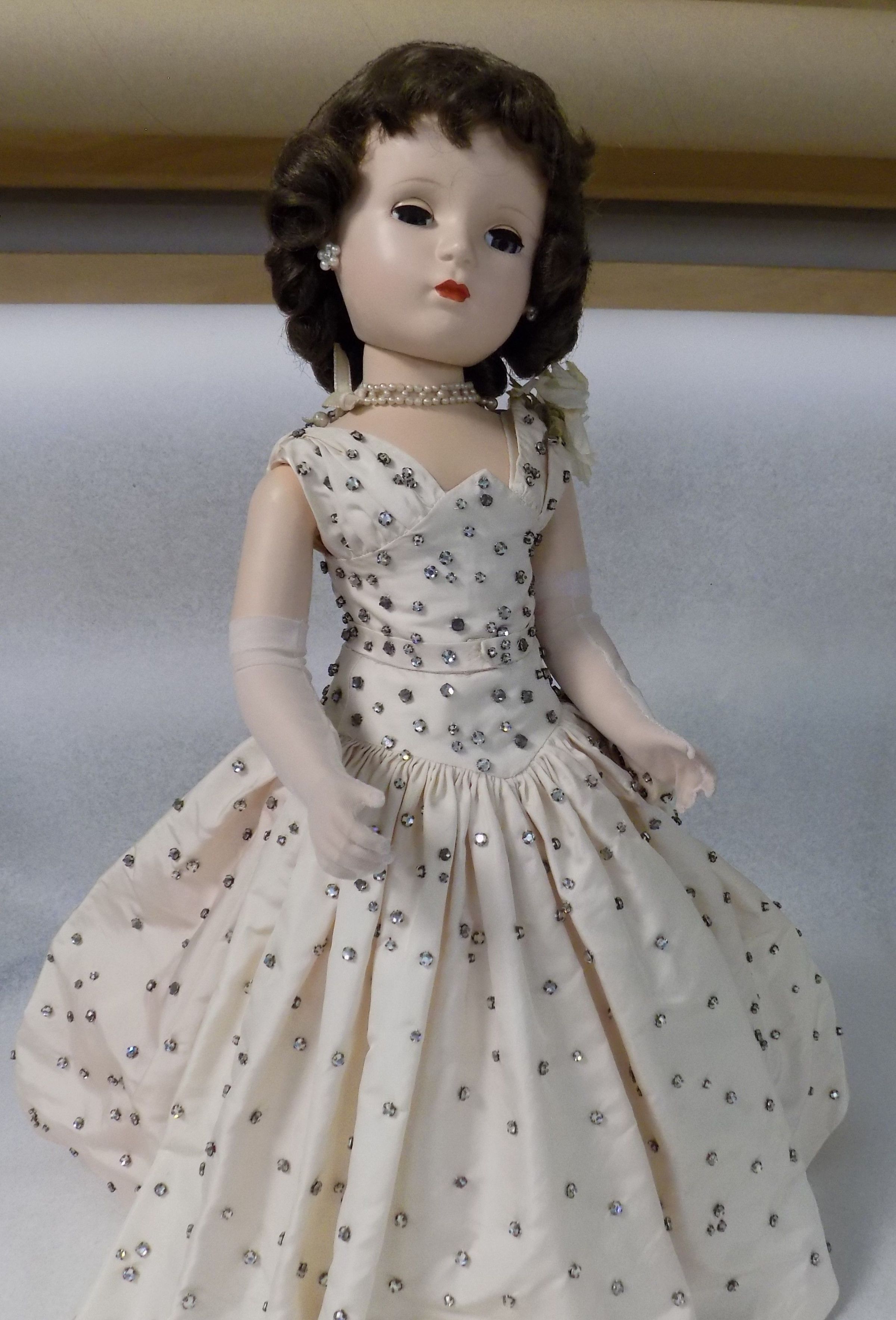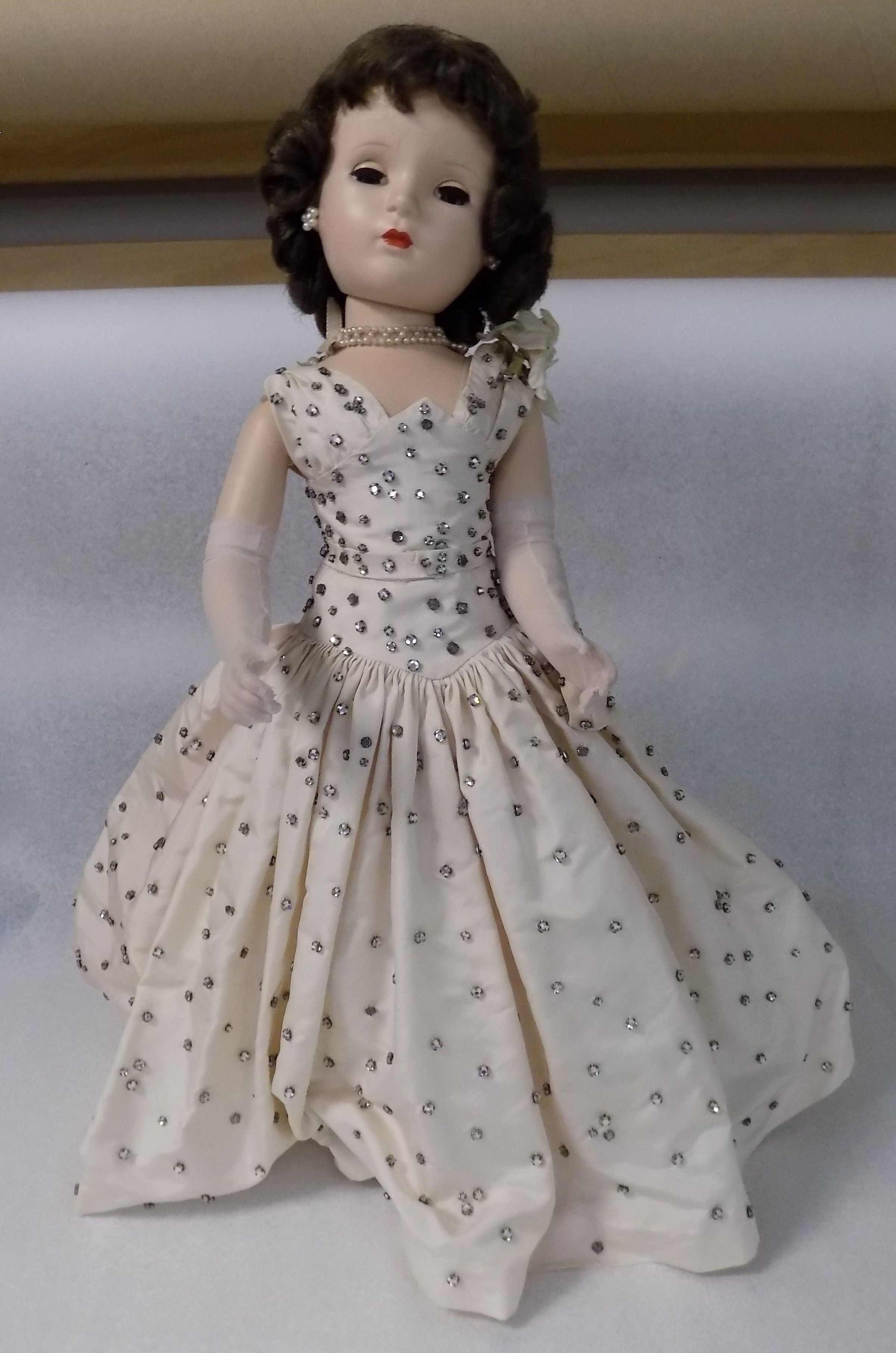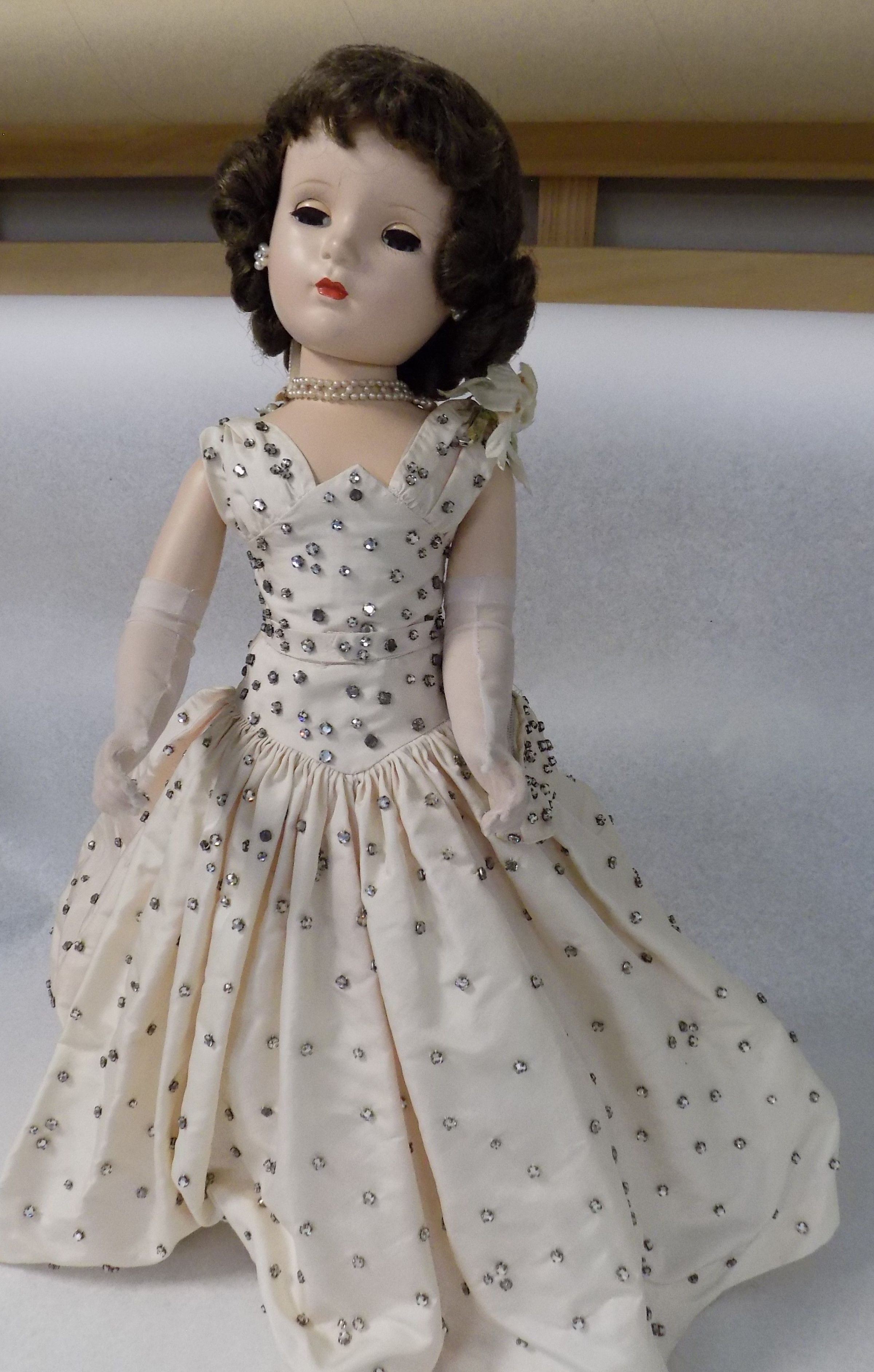 Item is a hand-crafted doll replica of former First Lady Mamie Doud Eisenhower at the inauguration of her husband Dwight Eisenhower in January of 1957. The creator of this doll, Mrs. Wesley Wilson, put lots of research into the her design process, modeling the doll's shoes, curly hairdo, gloves, accessories, and pink dress after Eisenhower's real outfit. Wilson, who lived in Bethlehem, Pennsylvania, had originally donated the doll, along with 19 others inspired by the first ladies, to the Northampton Area Public Library in October of 1967. It then made its way to the Mamie Doud Eisenhower Public Library in Broomfield, where it went on display.Collection