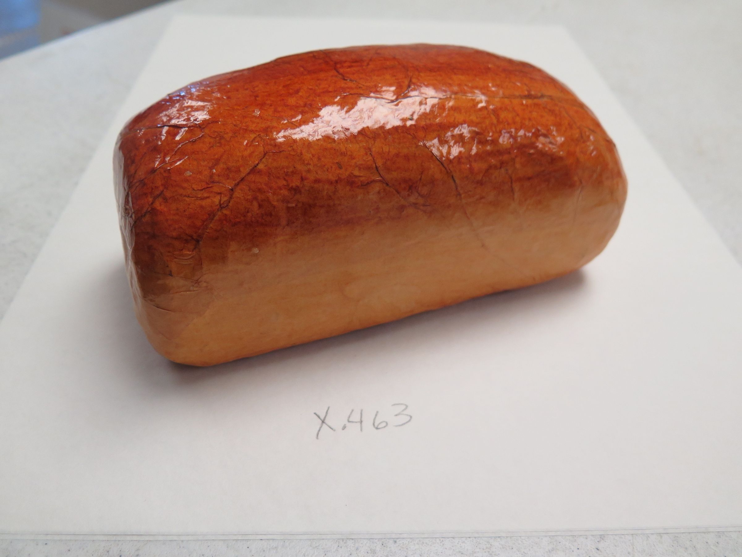 This is a paper mache prop loaf of bread. The prop bread measures 3.5" (h) x 3.25" (w) x 7" (l).
