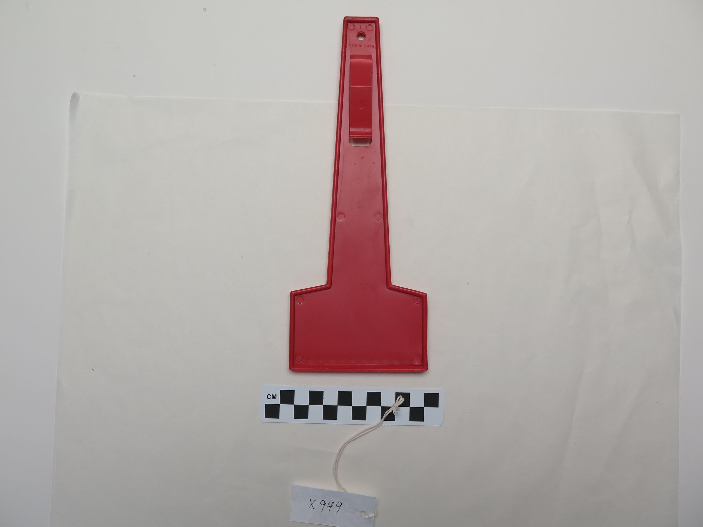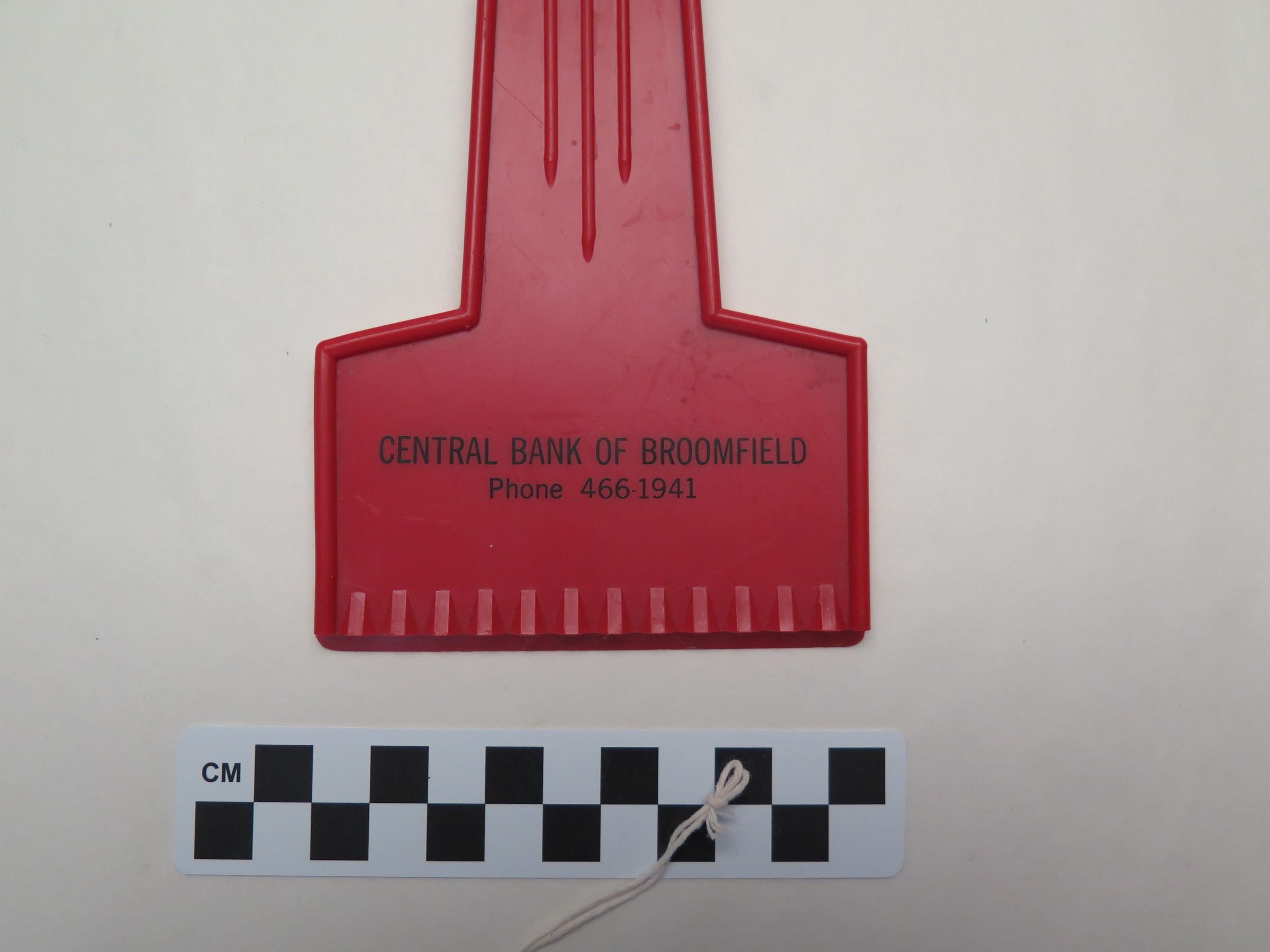 This is a red plastic ice scraper with black text on the front that reads, "Central Bank of Broomfield". The ice scraper measures 3.75" (w) x 9.5" (l).