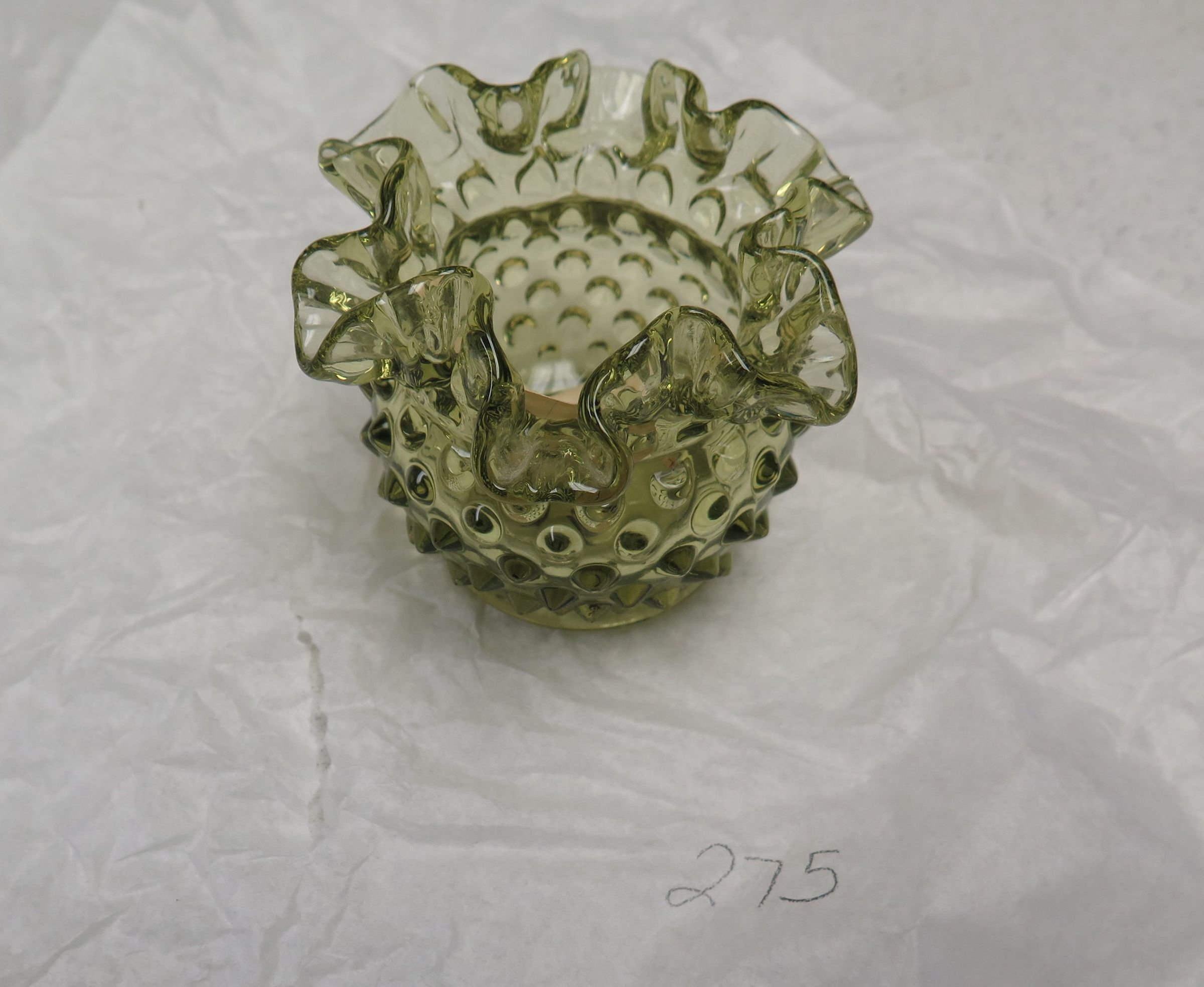 This is a green glass vase with textured sides and a decorative border around the opening. The vase measures 3" (h) x 4" (dia).