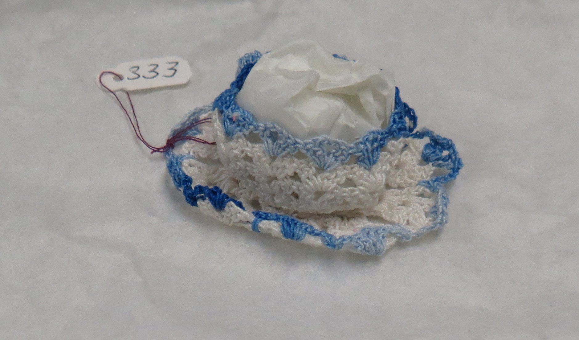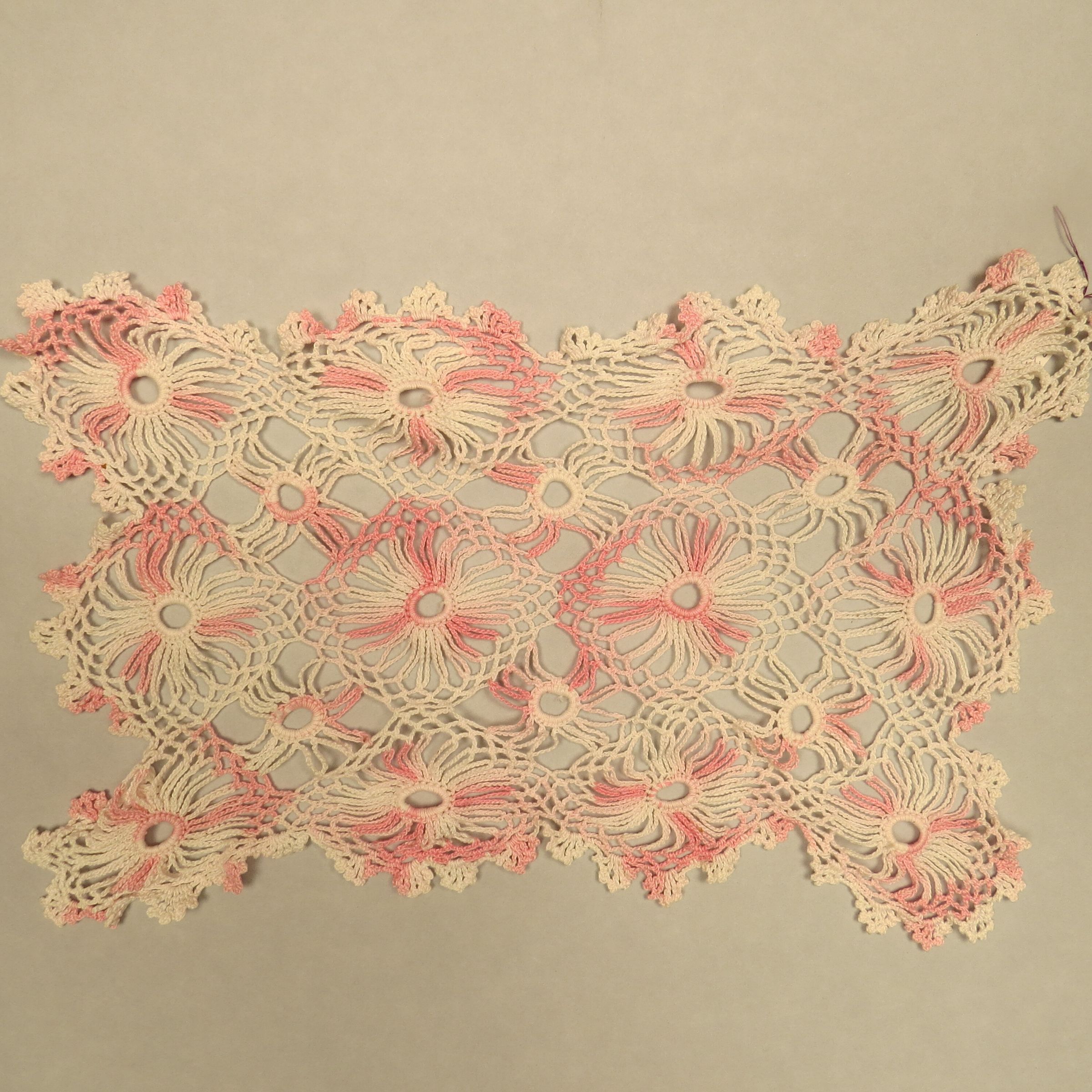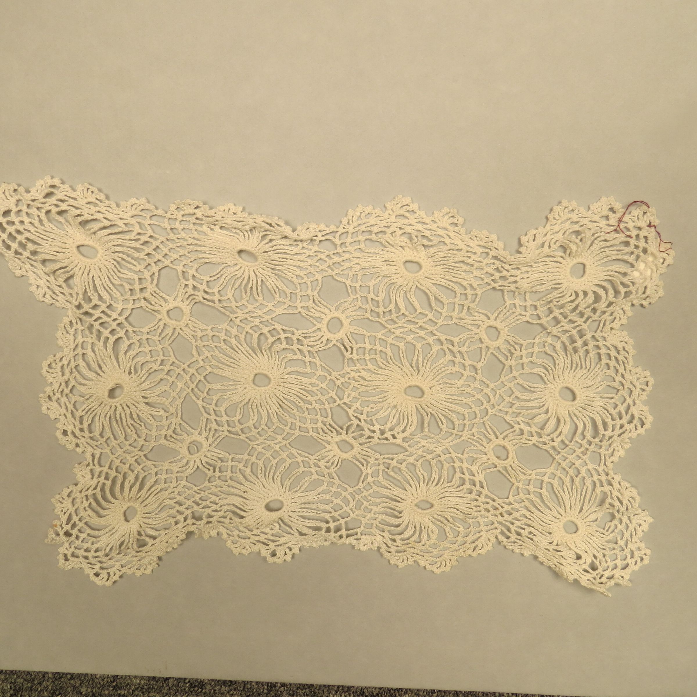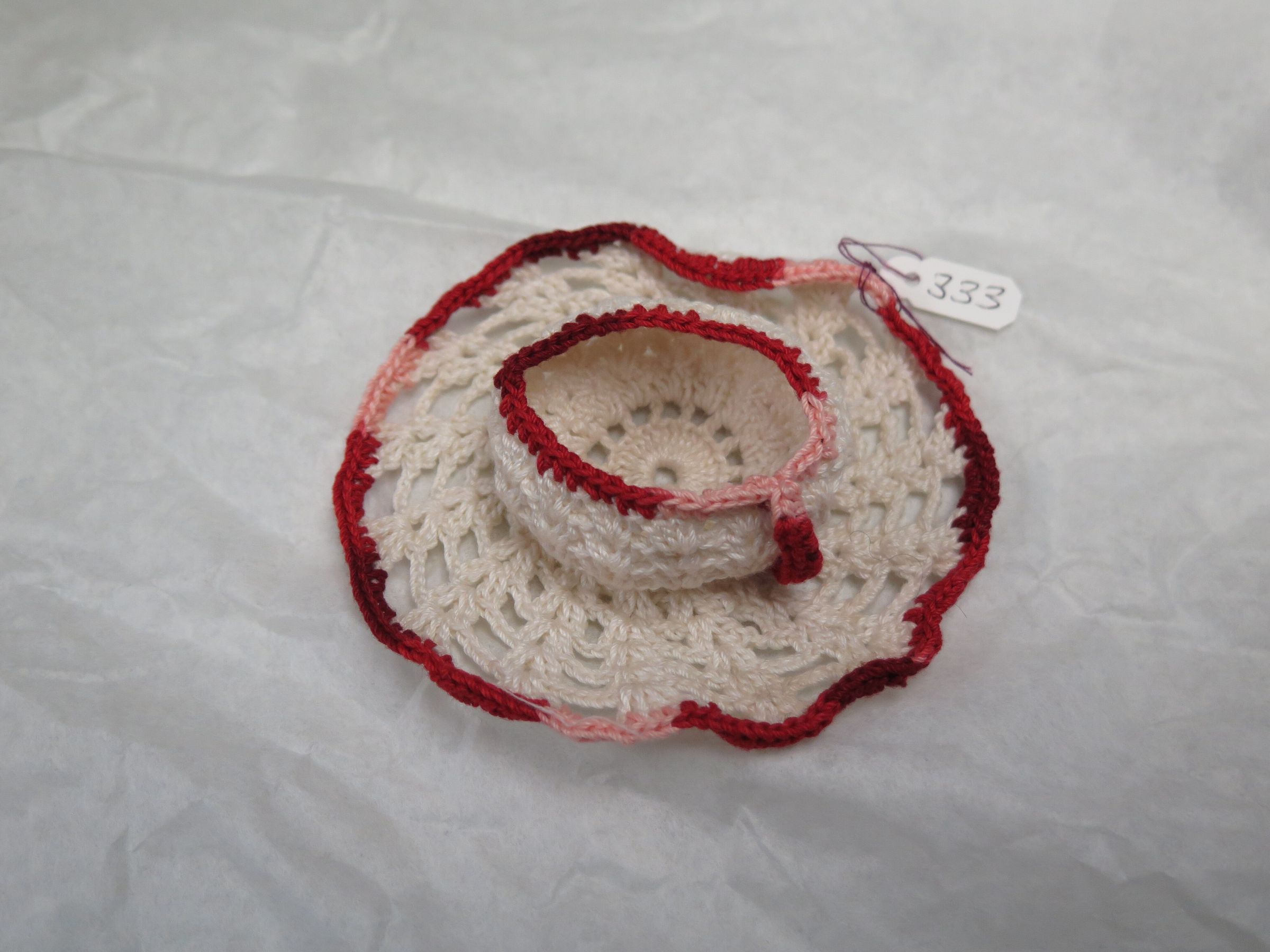 This is a set of 4 crocheted items. Two are miniature cup and saucers. One has a blue rim and the other has a red rim. The red cup and saucer measures 3.5" (h) x 1.5" (dia). The blue cup and saucer measures 1" (h) x 2.5" (dia). The other 2 are doilies. One doily is a pink and white crocheted piece that measures 6" (w) x 11" (l). The other doily is a white crocheted piece that measures 6" (w) x 12" (l).