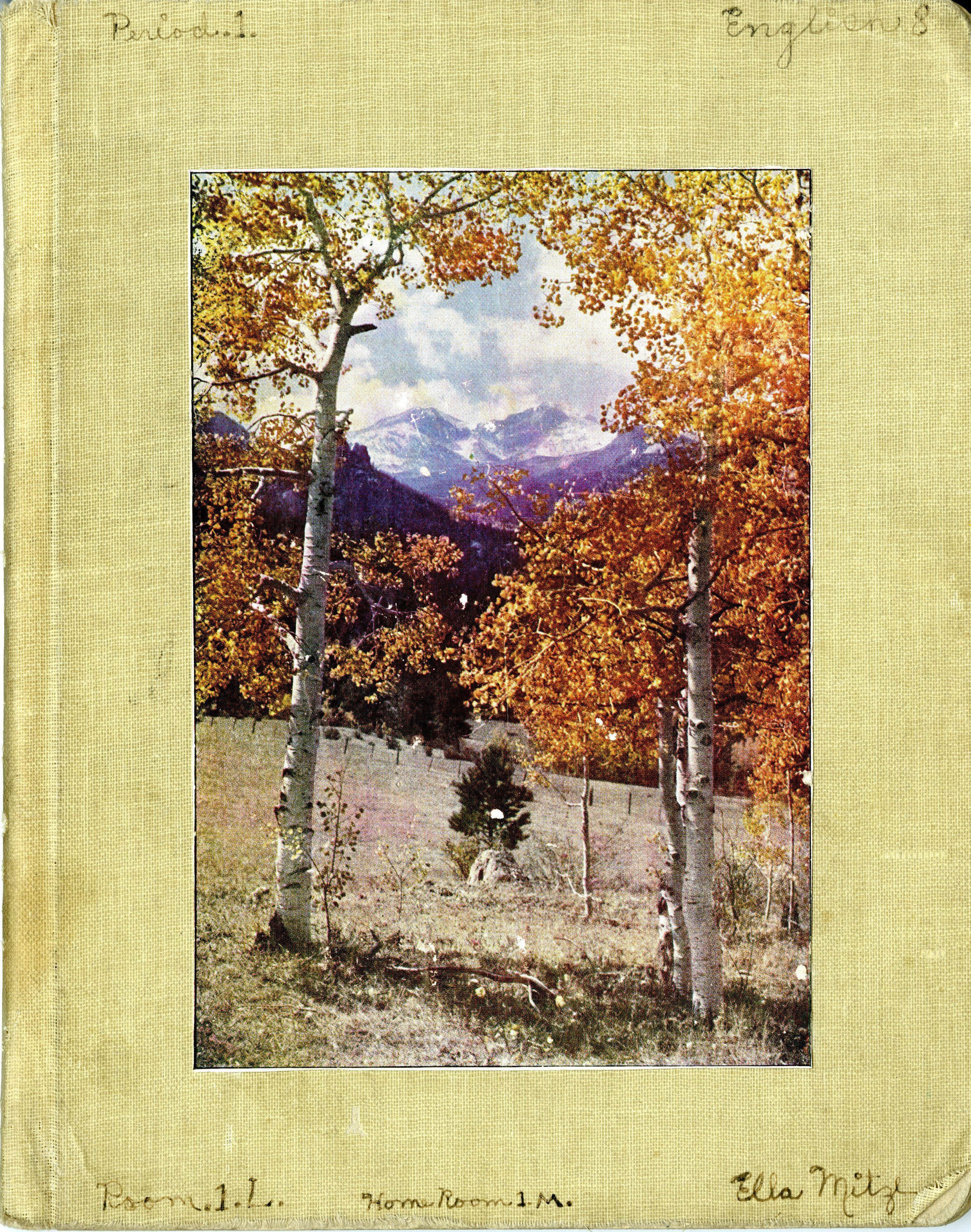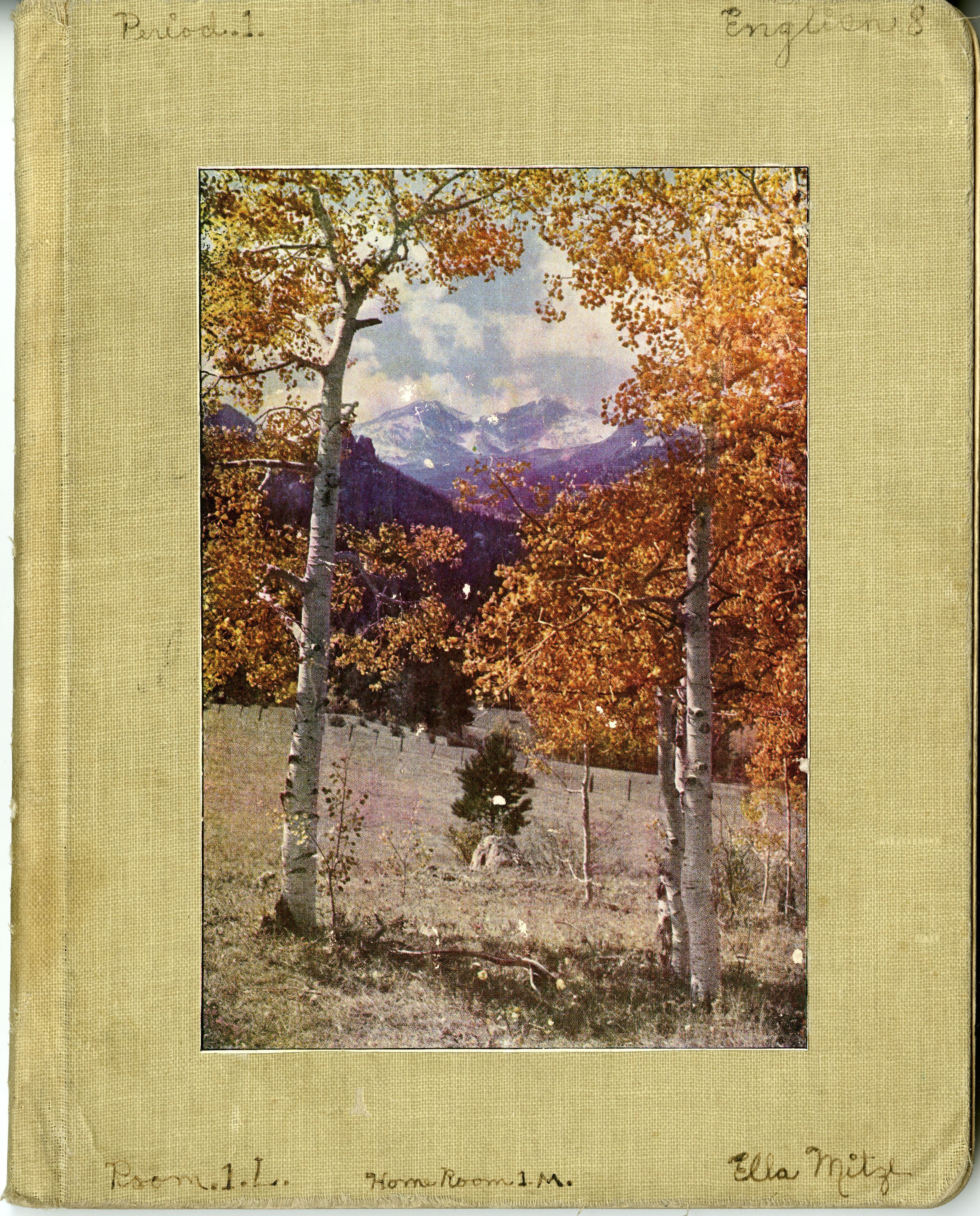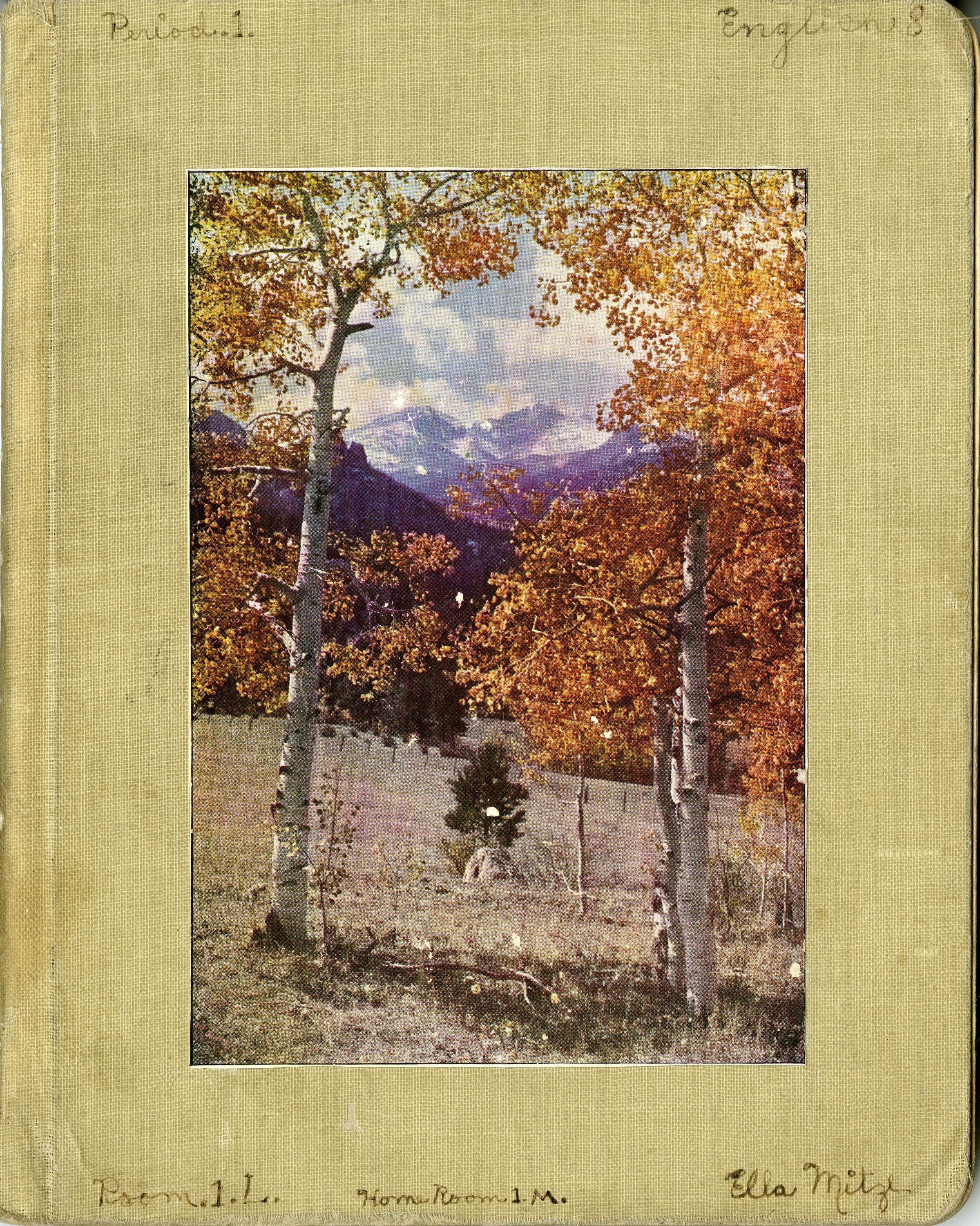 A composition book used by Ella Mitze for her high school English class, 1928. The book is 8" (w) x 10" (h) x .5" (d), with a hard, fabric cover. The book is also bound with string, covered by fabric on the outside spine. The front cover has a magazine clipping with a photographic picture of aspen trees in a field with mountains in the background. The picture is black and white, but with portions of the image colored in with gold and green on different trees. Mitze wrote various labels for the notebook on the cover in pen: "Period 1" in the upper left corner; "English 8" in the upper right; "Room.1.L." in the lower left; "Home Room 1.M." on the bottom edge; and her name, "Ella Mitze" in the lower right corner.