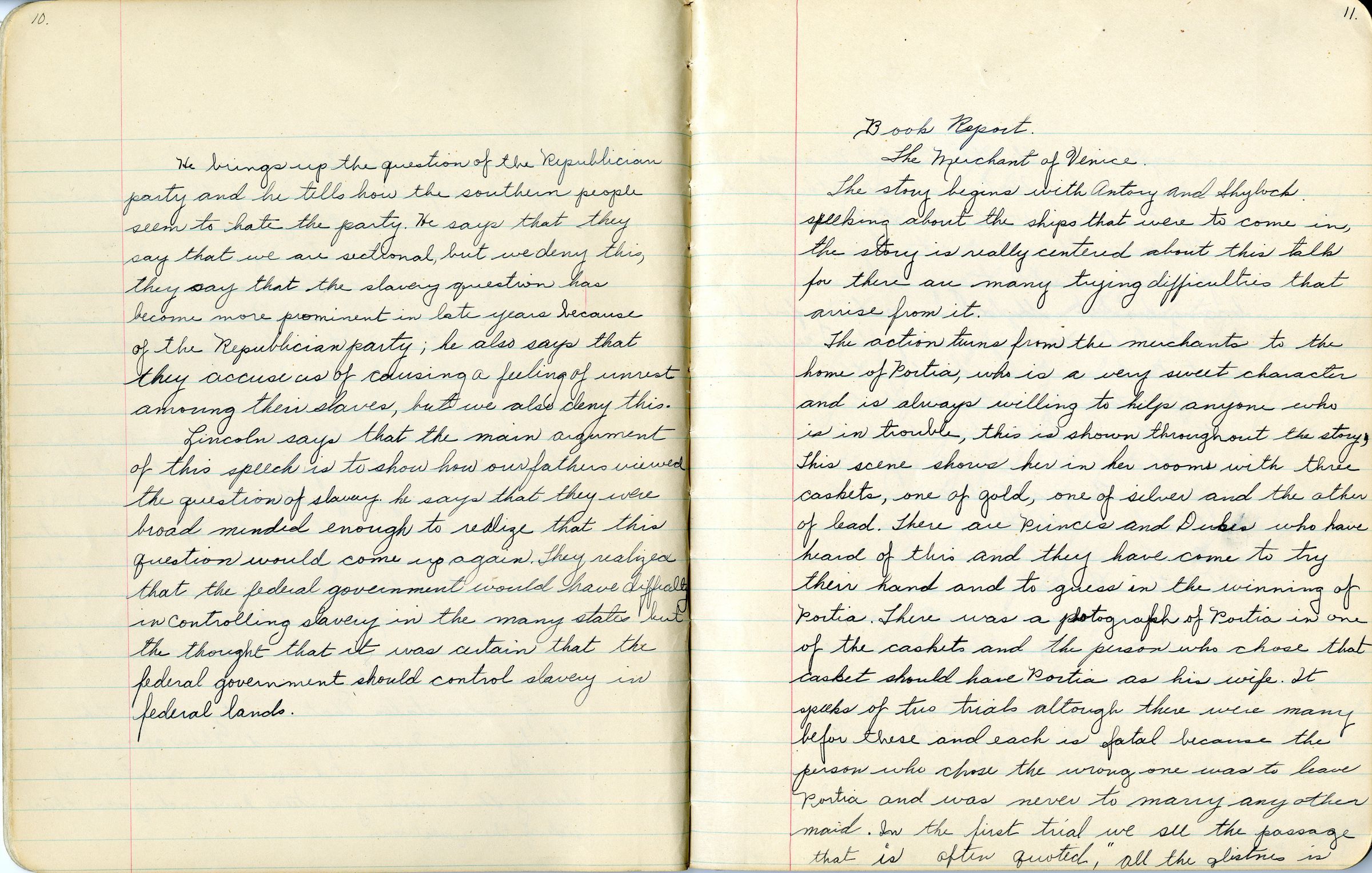 The inside cover reiterates the information on the cover, including the date "Feb 20, 1928" and the school, "North High School." A magazine clipping with a photographic image of the Abraham Lincoln statue in Lincoln Memorial with two men standing near it is just below the inscription. The first page has an index which serves as the book's contents, including compositions, spelling, quotations, and "miscellaneous." The compositions pertain to a variety of subjects, including Abraham Lincoln and slavery, Edmund Burke's views on the American colonies and politics, and book reports on works like A Tale of Two Cities, along with other writings. The spelling assignments also include definitions and synonyms of the spelled words, and correlate somewhat with the composition assignments' subject matter. Many of the quotations, likewise, were collected from the individuals discussed in the compositions, like Abraham Lincoln. The miscellaneous section of the book includes pasted clippings of various poems from newspapers and magazines that Mitze collected.Collection