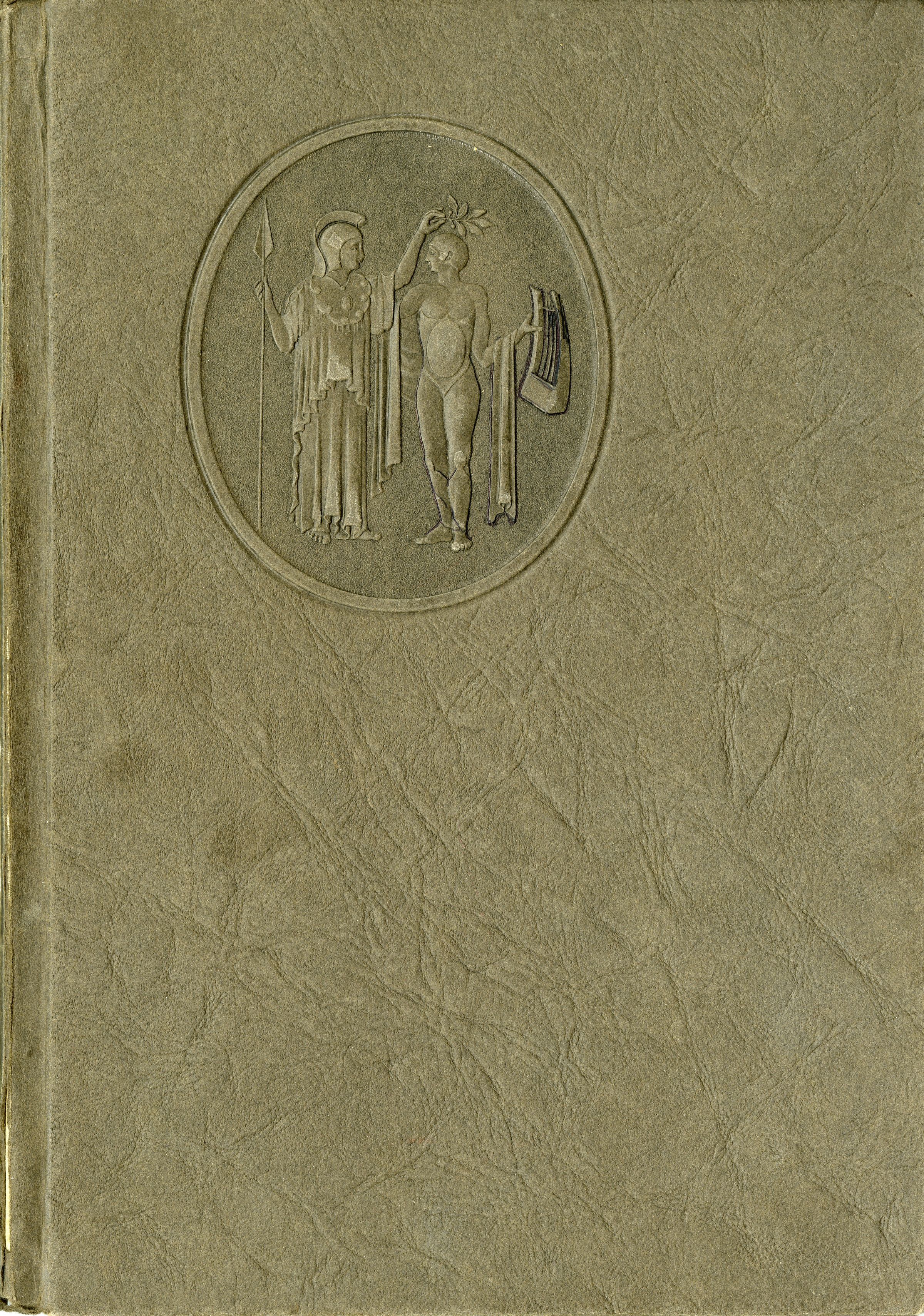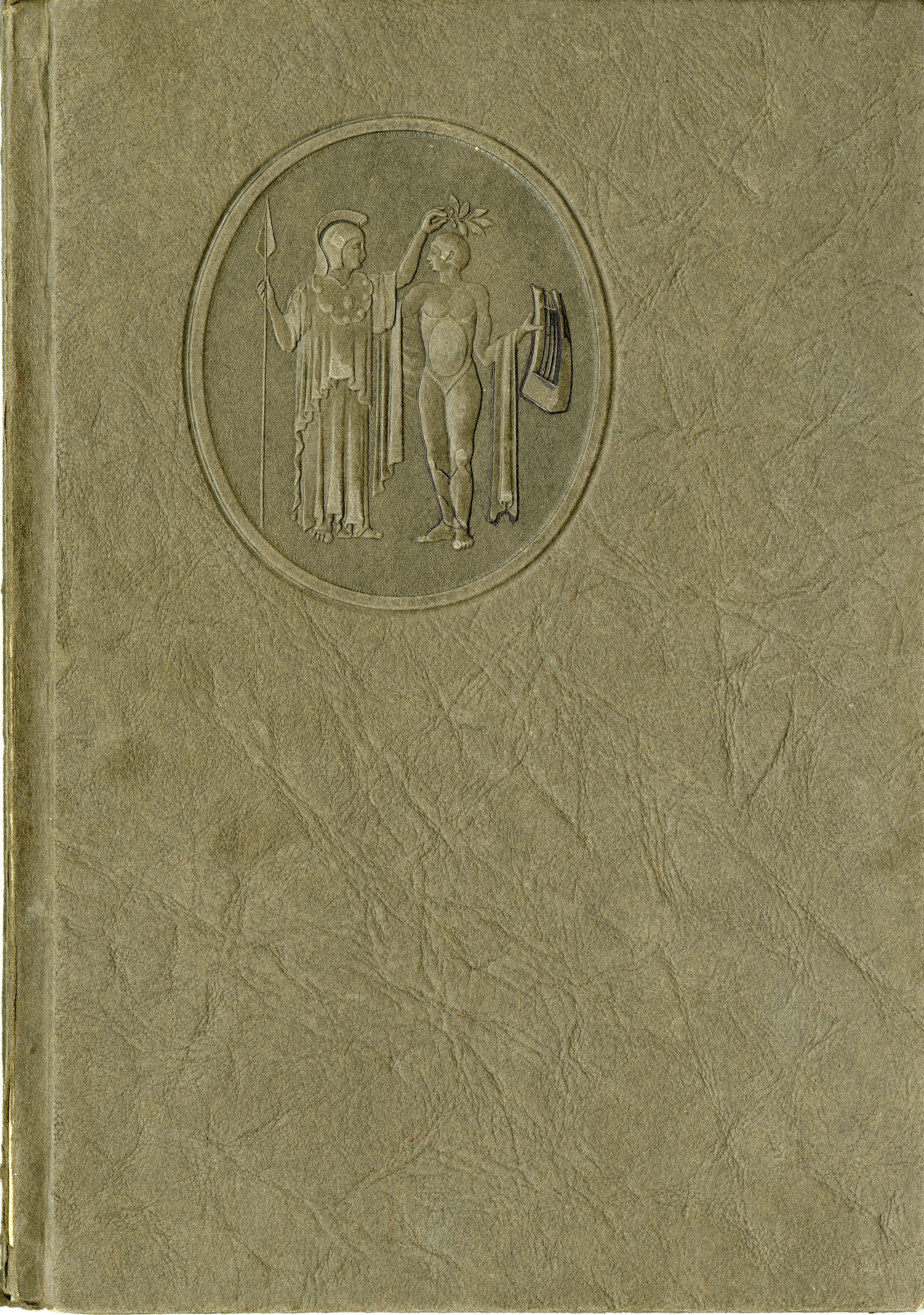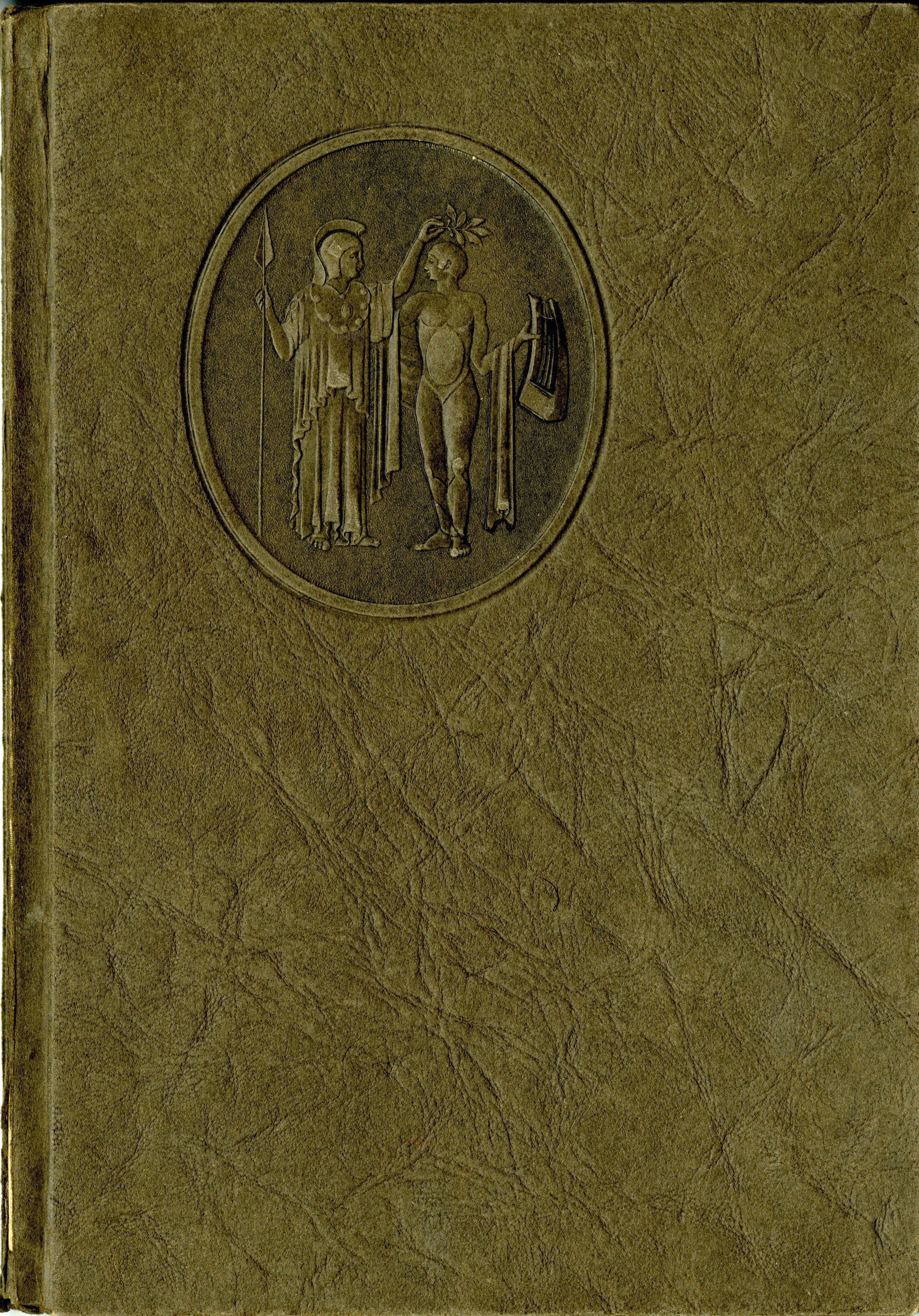 A yearbook from North High School in Denver, "The Viking," that belonged to Broomfield resident Ella Mitze, 1926. The book is 7.5" x 11", hardcover. The cover has a textured, raised image of two mythological figures molded or stamped onto it, one of them likely the hero Aeneas; the figure on the left has a staff and olive branch, wearing robes, while the one on the right has armor and what appears to be a lute or harp. The theme of the yearbook is the mythological story from the Latin poem the Aeneid, which many portions of the book compare to North High students' experiences. Several images in the book also pertain to this theme, including a "Shield of Aeneas" picture in the inside cover. Ella Mitze's name is inscribed in pen just above this image.