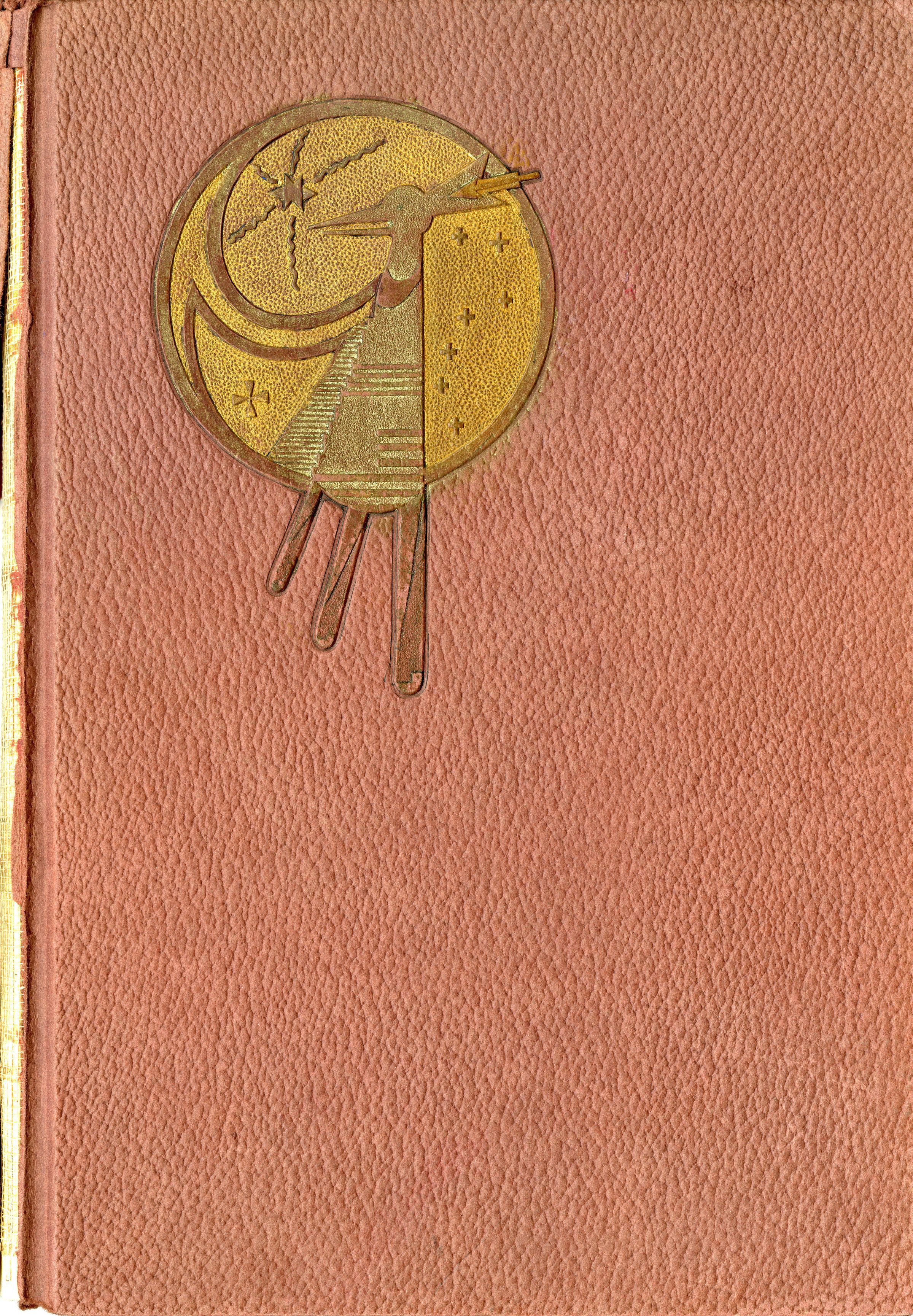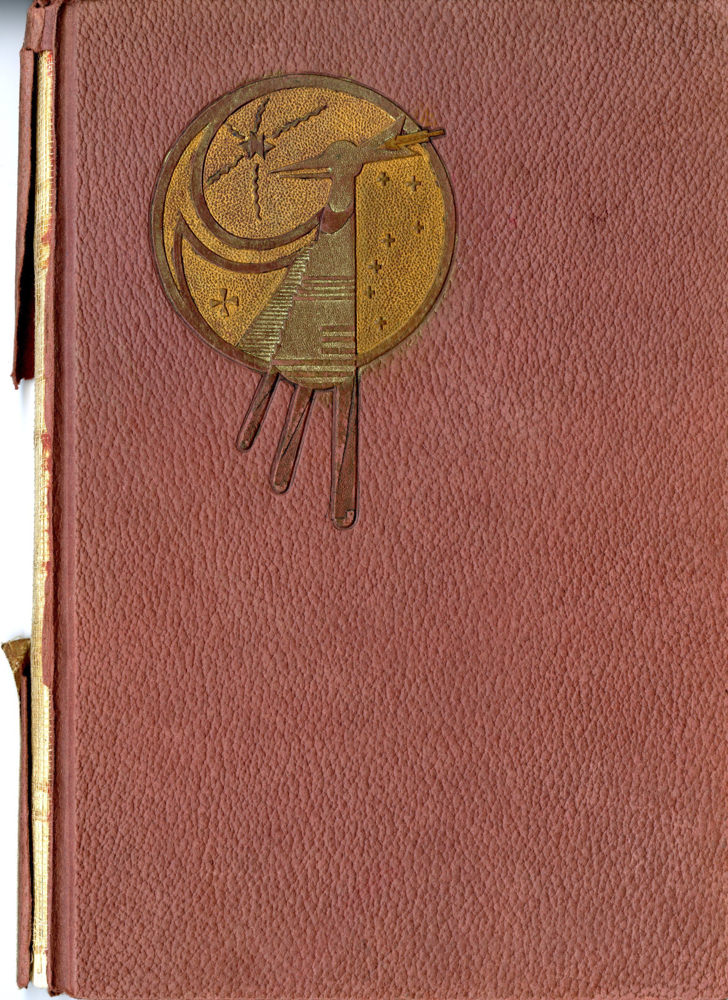 A yearbook from North High School in Denver, "The Viking," that belonged to Broomfield resident Ella Mitze, 1927. The book is 7.5" x 11", hardcover. The cover has a textured, raised image of a bird-like figure, the sun, and stars molded or stamped onto it in gold coloration, likely depicting a Hopi Man-Eagle as described in the book's introductory pages. The theme of the yearbook is the rite of passage for young Hopi men, as compared to high school students' academic careers. Several images in the book also pertain to this theme, including a round Native American design in the inside cover. Ella Mitze's name is inscribed within the inside cover image.