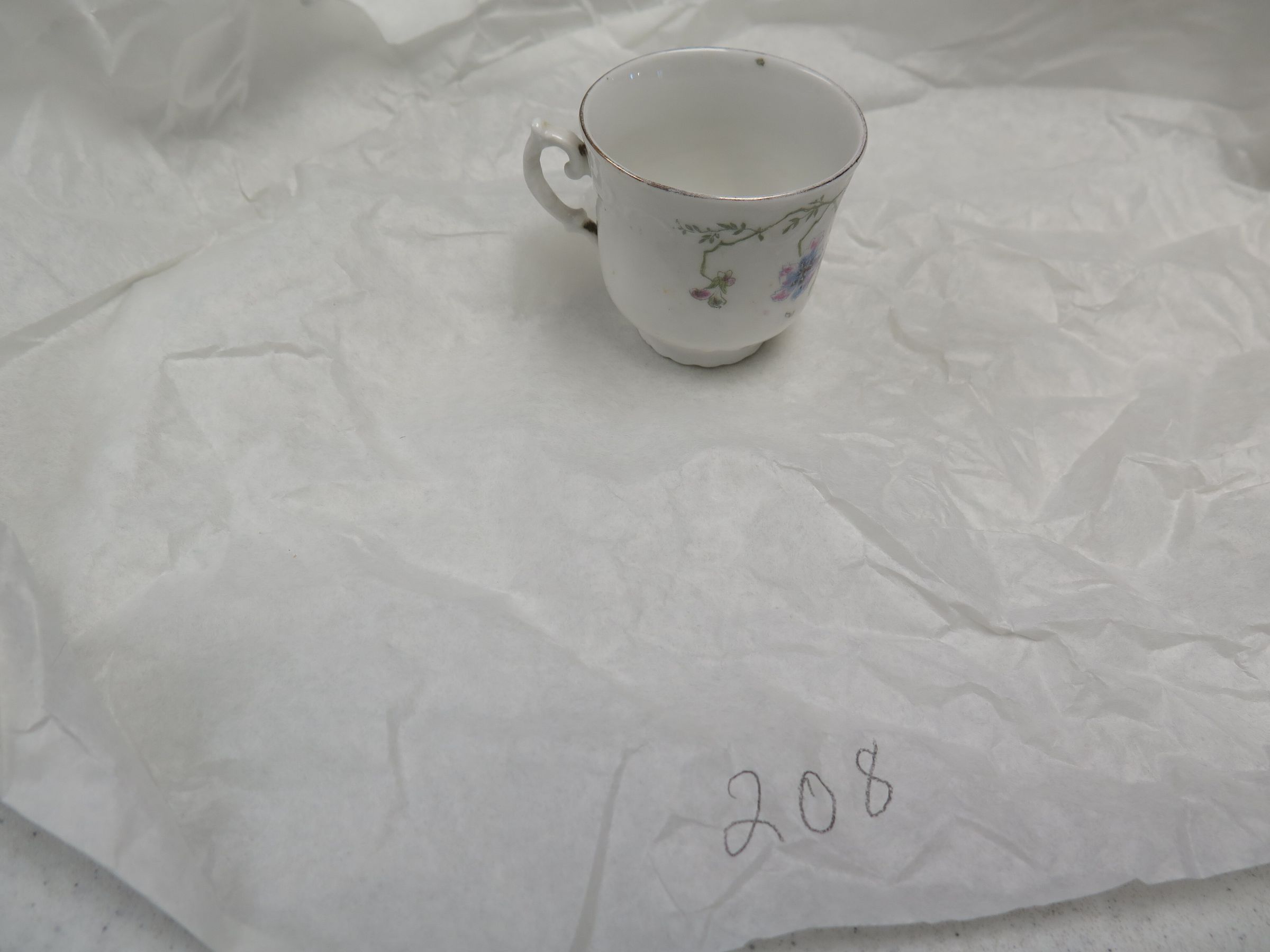 This is a white china teacup with a handle, a silver rim, and purple flowers painted on the side. The teacup measures 2.5" (h) x 2.5" (dia).