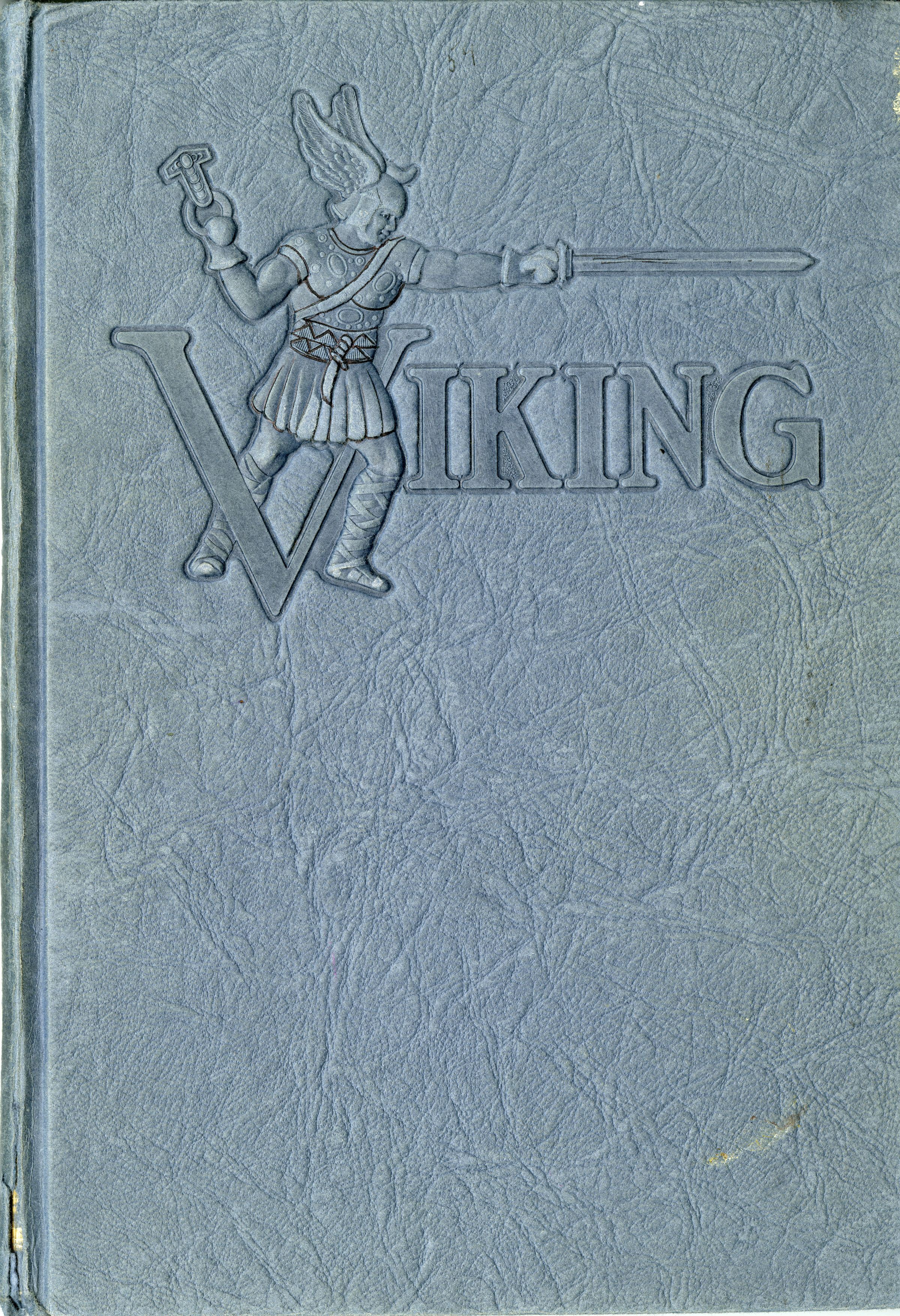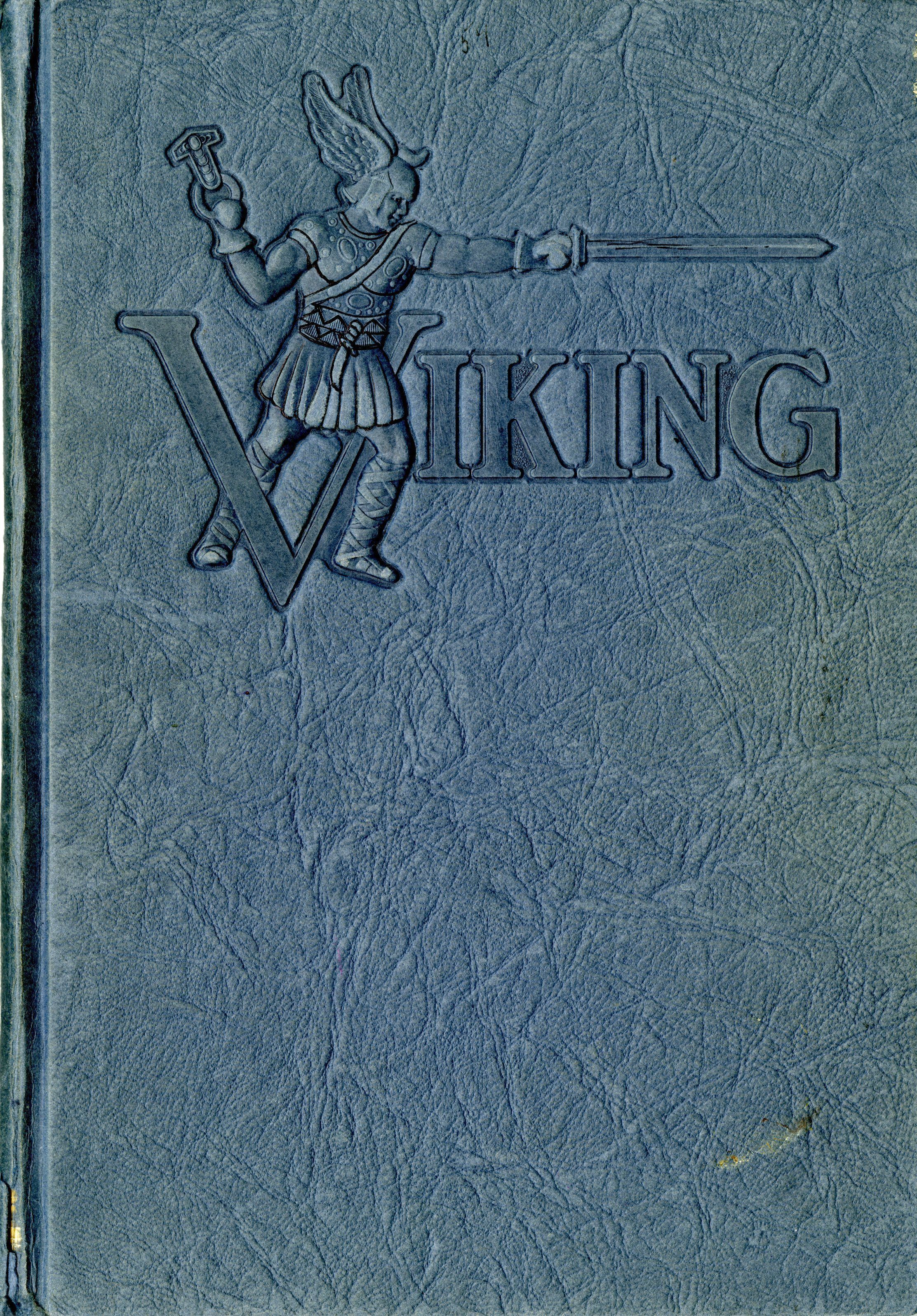 A yearbook from North High School in Denver, "The Viking," that belonged to Broomfield resident Ella Mitze, 1928. The book is 7.5" x 11", hardcover. The cover has a textured, raised image of a viking in profile, wearing full armor and thrusting a sword. The vikings were North High School's sports team and mascot. Ella Mitze's calling card is pasted into the inside cover.