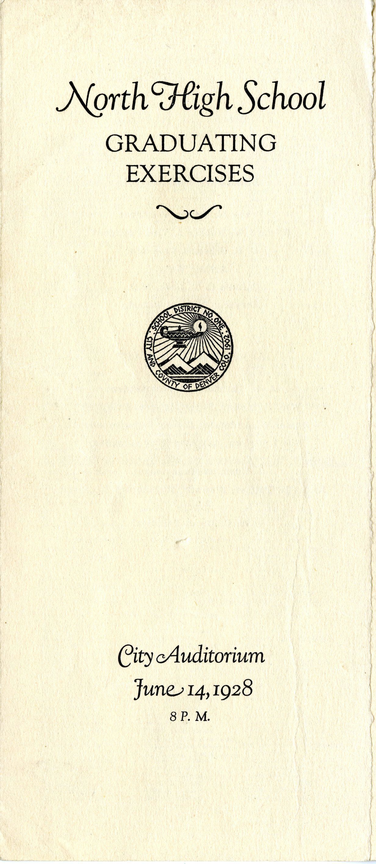 A program for Ella Mitze's graduating exercises at North High School in Denver, dated June 14, 1928. The program is trifold, 9.5" x 12" when unfolded. The front of the program has the City and County of Denver School District One seal, depicting a shining oil lamp with sun rays branching out over mountains. The location of the exercises is listed as the City Auditorium, with the exercises to commence at 8 pm. On the inside of the program, Board of Education members and administrative staff are listed, along with the program of the graduation. Various honor rewards, scholarships, and other distinctions are also listed, with the full list of graduates on the back.