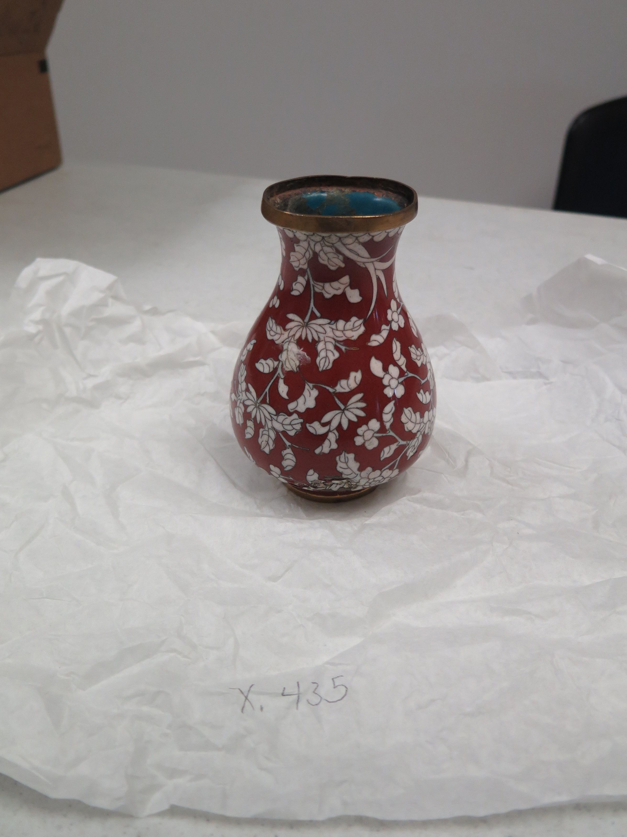 This is a cloisonne vase that is painted red with white flowers. The vase measures 5.5" (h) x 4" (dia).
