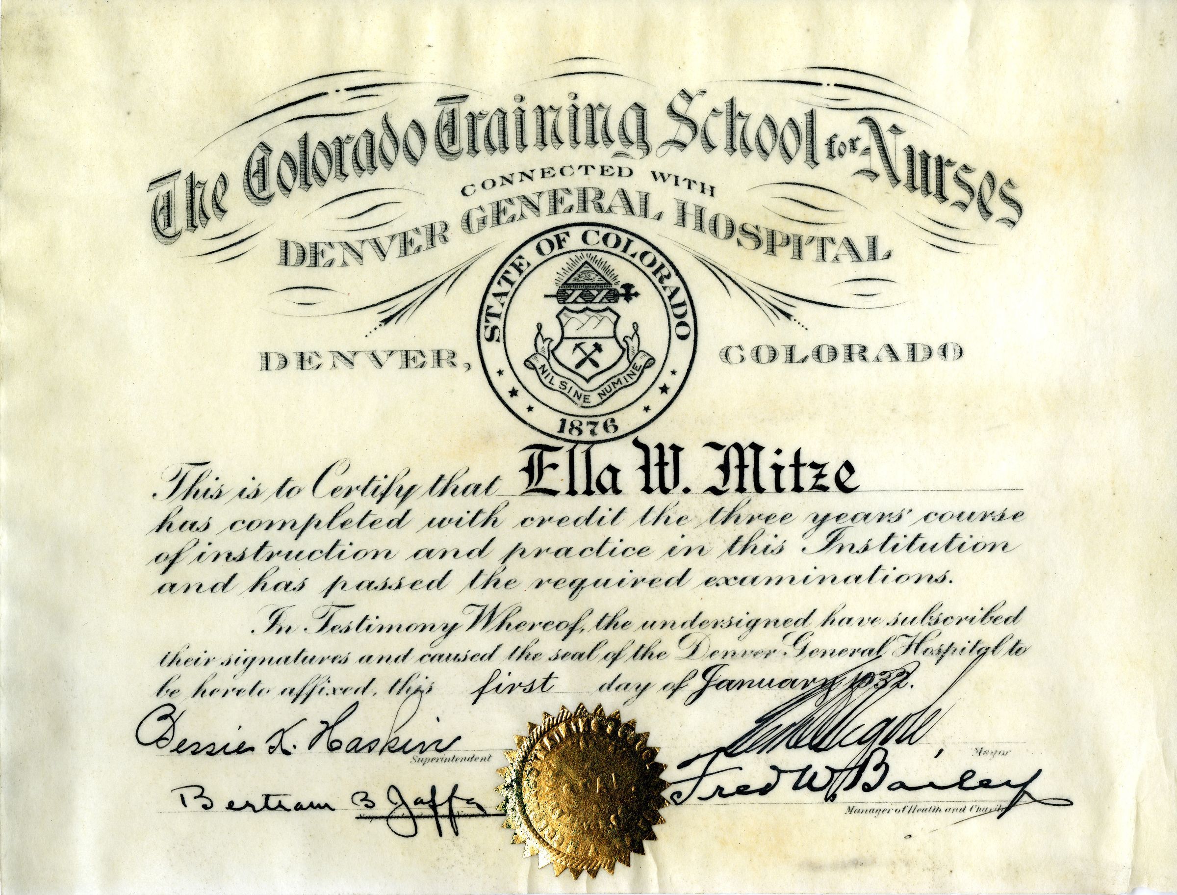 Graduation certificate for Ella W. Mitze from the Colorado Training School for Nurses connected with Denver General Hospital, January 1, 1932. The certificate is 6" x 8" on a wax coated paper. The State of Colorado seal is printed prominently beneath the school's name, printed in stylized text, at the top of the certificate. The main text certifies that Ella Mitze completed her credited course work for the school's three year program and passed her required examinations. The certificate is signed at the bottom in ink by Superintendent and Director for the School of Nursing, Bessie K. Haskin; Denver Mayor George D. Begole; Manager of Health and Charities Fred W. Bailey; and Deputy Manager of Health and Charities Bertram B. Jaffa. A gold seal for the Colorado Training School for Nurses is imprinted at the bottom of the certificate. The certificate is numbered 2016.20.2a.