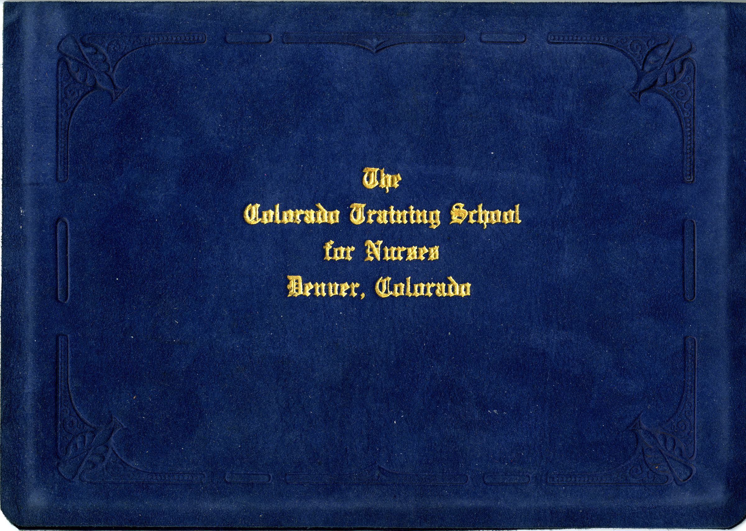 The certificate includes a blue, felt and fabric folded cover enclosure, 6.5" x 9." The front of the enclosure has a pattern border on the front, with gold text lettering in the middle stating, "The Colorado Training School for Nurses, Denver, Colorado." The inside has red fabric sewed in. The cover is numbered 2016.20.2b.