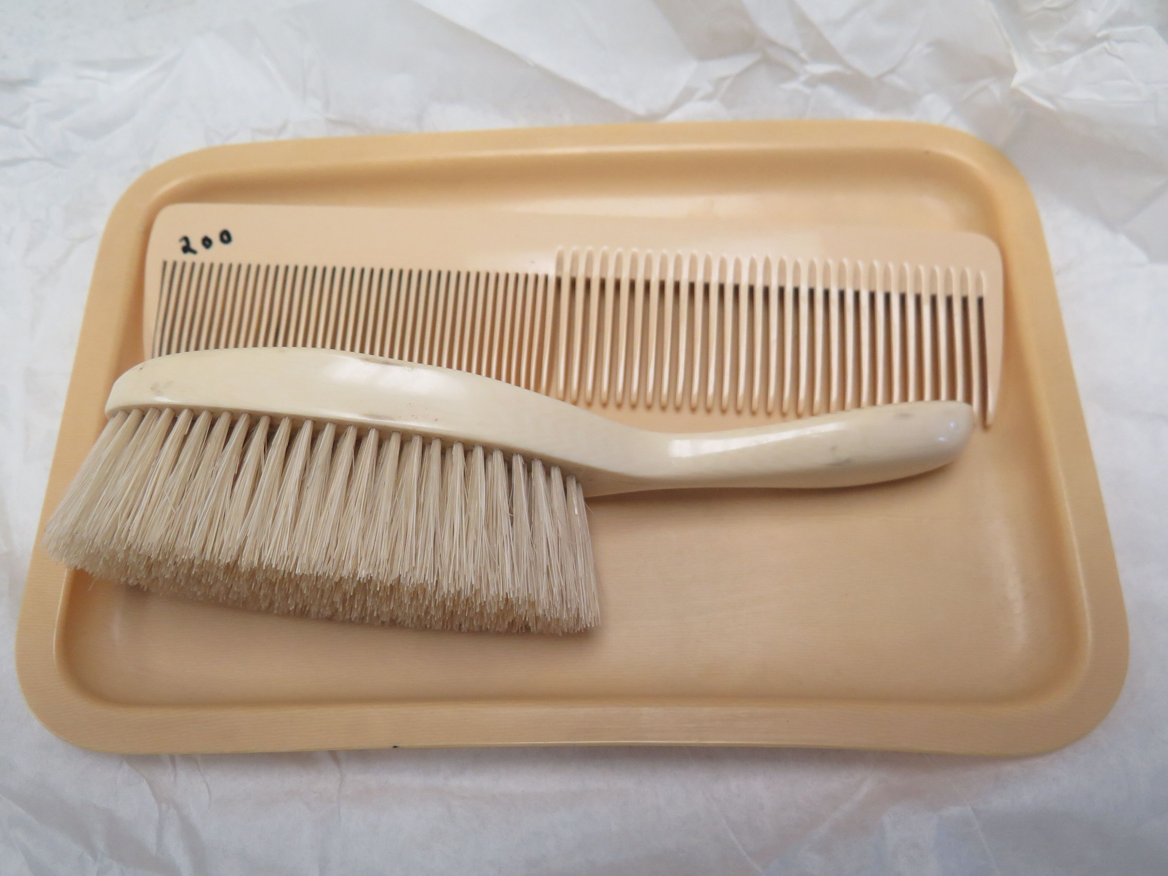 This is a hair care set that consists of a comb, a brush, a tray and a hand mirror. The first 3 items are made of cream colored plastic. The tray measures 2" (h) x 6.5" (w) x 10" (l). The hand mirror has an orange celluloid frame. The mirror measures 4.5" (w) x 12" (l).