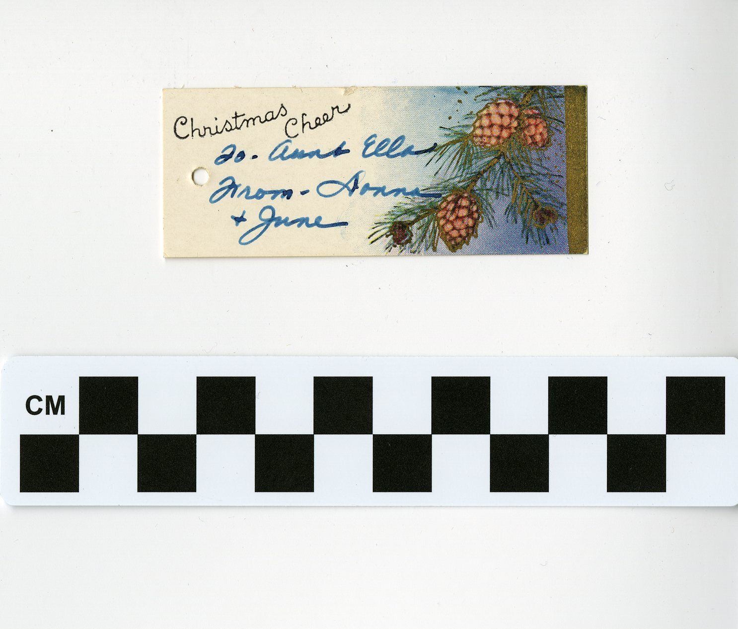Christmas gift tag from Donna Mitze Sauer and June Mitze Harper to Ella Mitze, undated. The tag is 1" x 2.75", on card stock. A color illustration of pine cones on a tree branch is depicted on the right side of the tag. "Christmas Cheer" is printed in cursive text in the upper left corner, just above a hole for tying string on the left edge. The tag is labeled in blue pen, "To - Aunt Ella. From - Donna & June." Donna and June were both nieces of Ella Mitze.Collection