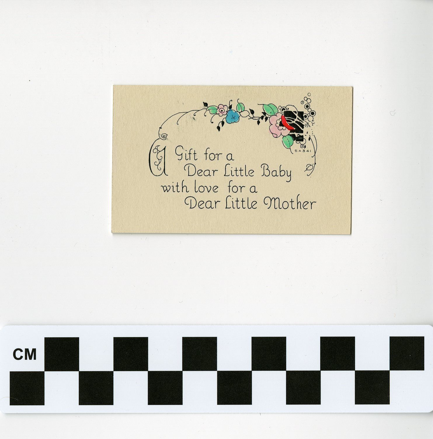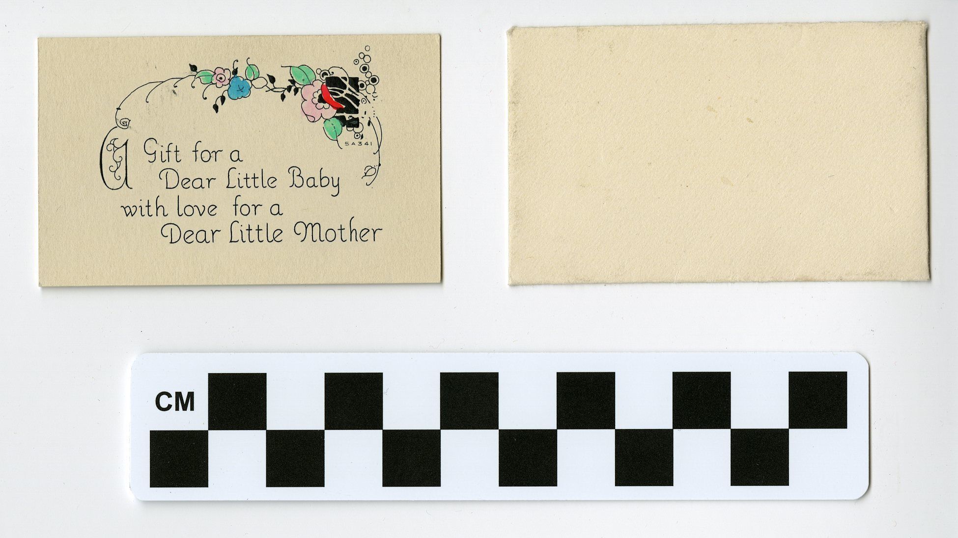 Small card with envelope congratulating Ella Mitze on the birth of her son, Vic Thaete, May 1933. The card and envelope are 1.75" x 2.5"; the card is one-sided. The front of the card has a color illustration of flowers along the top edge and in the upper right corner. The message "Gift for a Dear Little Baby with love for a Dear Little Mother" is printed on the front. The reverse side of the card has a written message in ink, stating "Congratulations from the McKee's."
