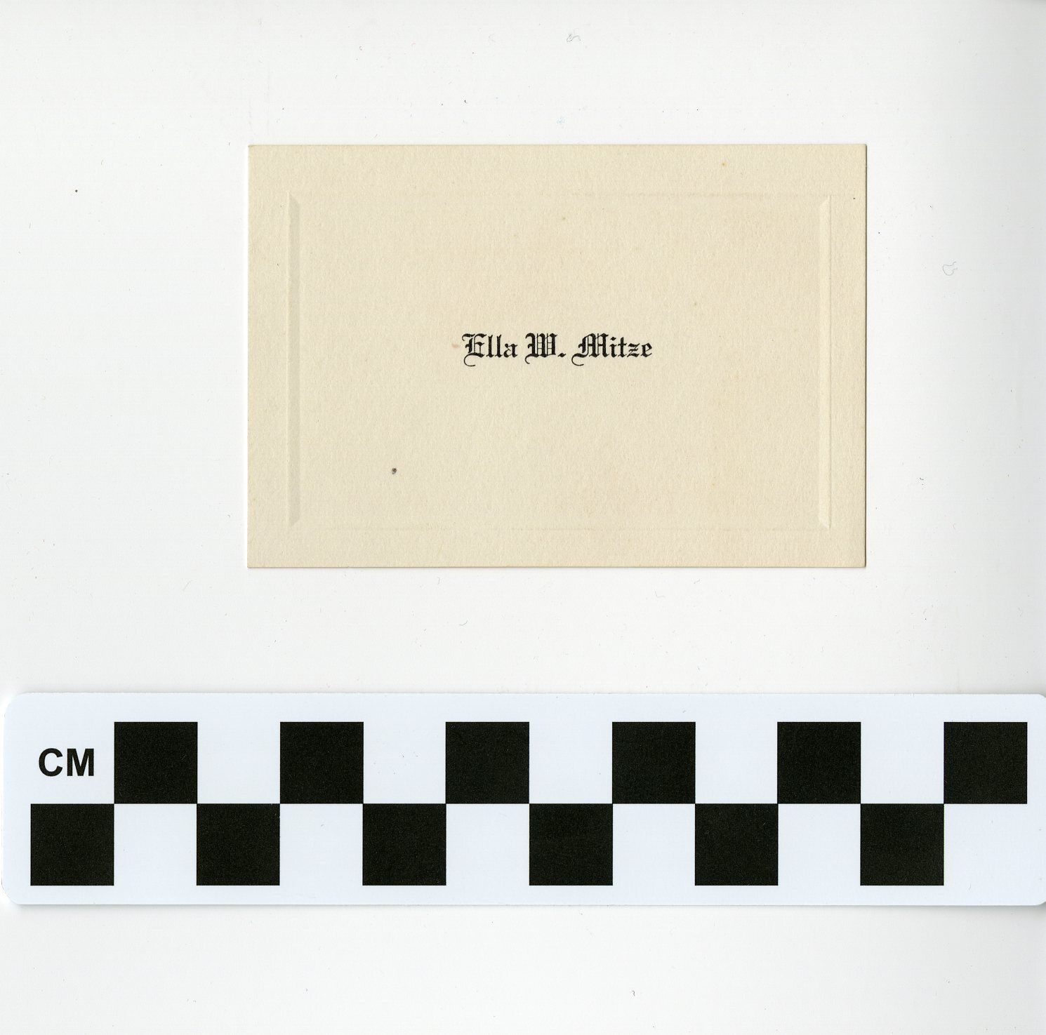 Calling card of Ella W. Mitze, undated. The card is 2" x 3," with a basic raised border around the edges. The text is printed in an old English style font. The card was probably used by Mitze sometime between her high school years in the late 1920s and her time in nursing school at the Colorado Training School for Nurses, through 1931.Collection
