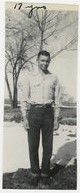 Black and white photograph of a young man standing near the Brunner farmhouse. The young man is dressed in a light shirt, dark pants, and dark shoes. Handwritten on the upper edge of the photograph is "17 years." Photograph was taken in winter as there is snow on the ground. The young man is probably Dale Brunner.