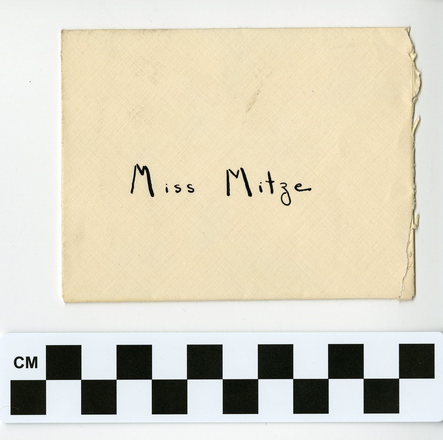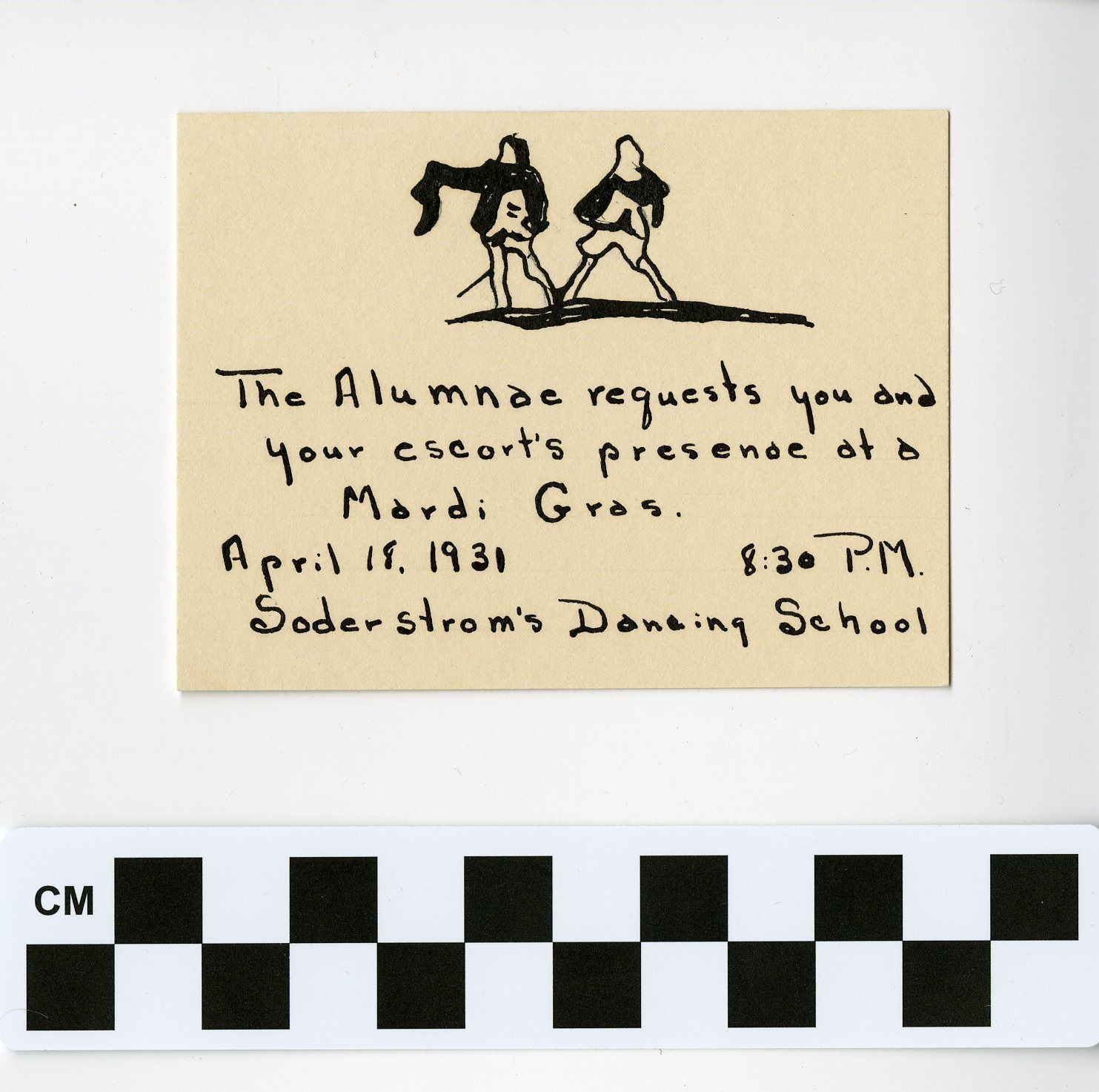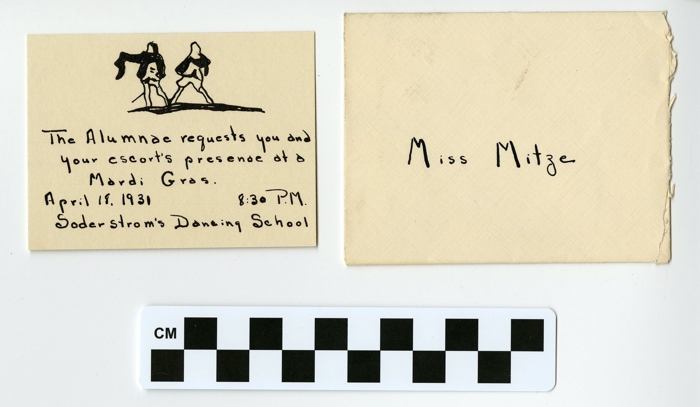 Invitation card with envelope for a Mardi Gras celebration from Colorado Training School for Nurses alumnae to Ella Mitze, 1931. The card is 2.75" x 3.5", the envelope 3" x 3.75". The invitation is all handwritten and illustrated in black ink on one side of the card, with a picture of two figures in costume dress featured at the top. The text reads, "The Alumnae requests you and your escort's presence at a Mardi Gras. April 18, 1931. 8:30 P.M. Soderstrom's Dancing School." The envelope has "Miss Mitze" written on the front in the same black ink. Ella Mitze attended the nursing school from 1929 through 1931.Collection
