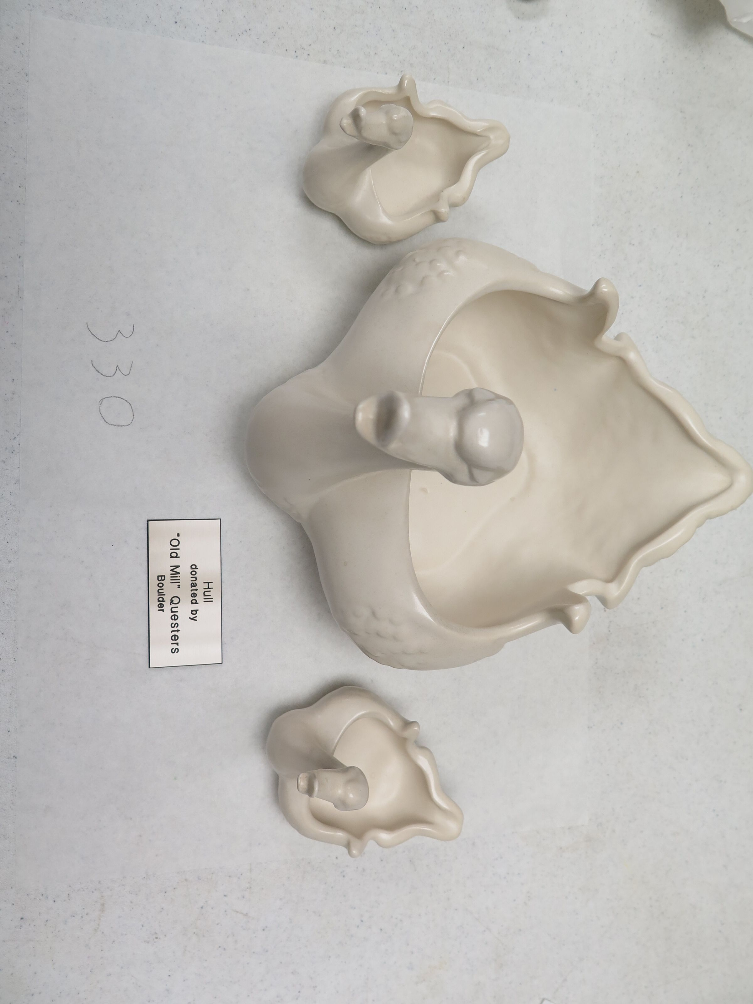 This is a set of 3 white Hull Duck planters. The large duck planter measures 8.5" (h) x 8.5" (w) x 10" (l). The 2 small planters measures 4.5" (h) x 3" (w) x 4.5" (l).