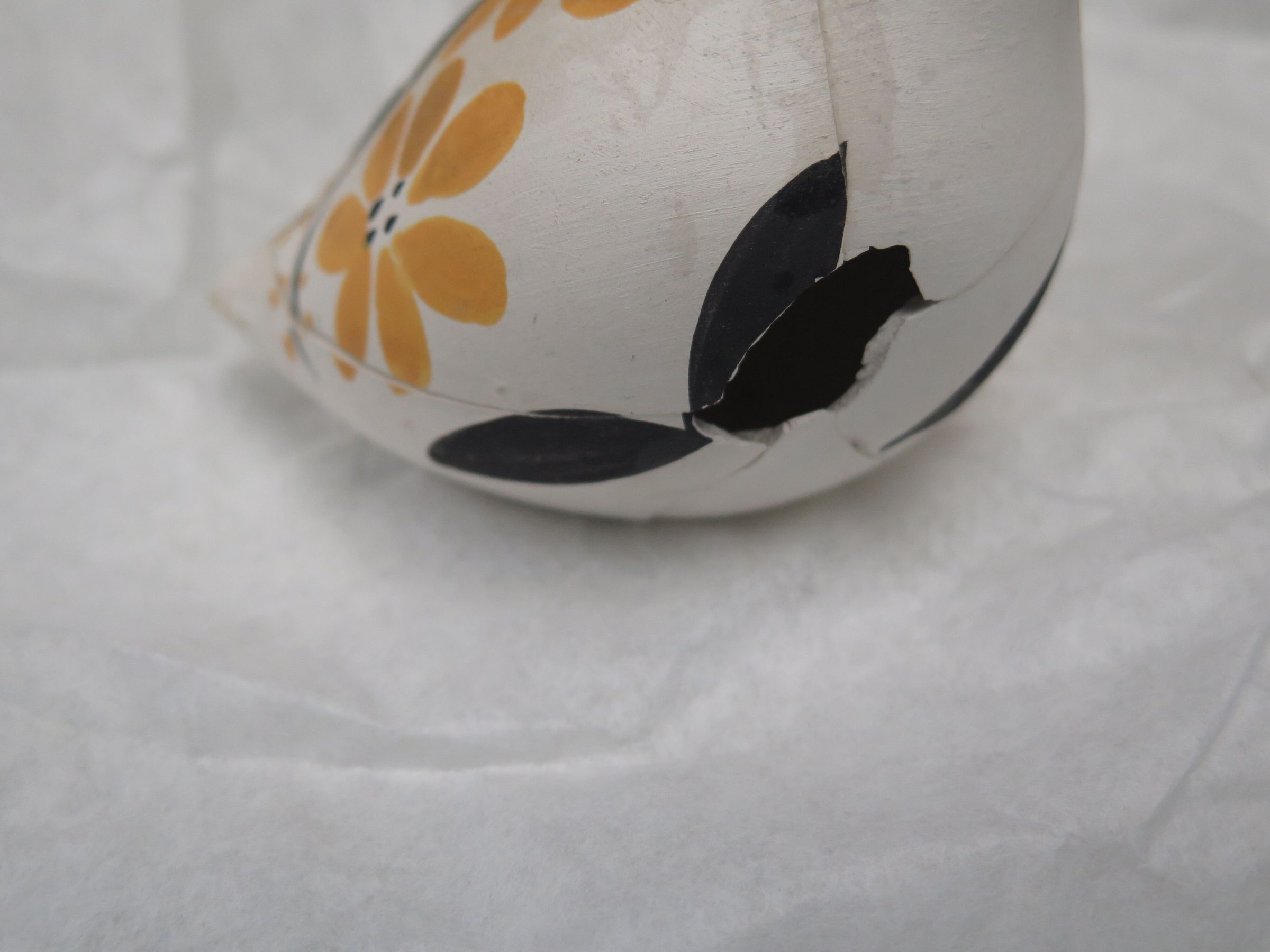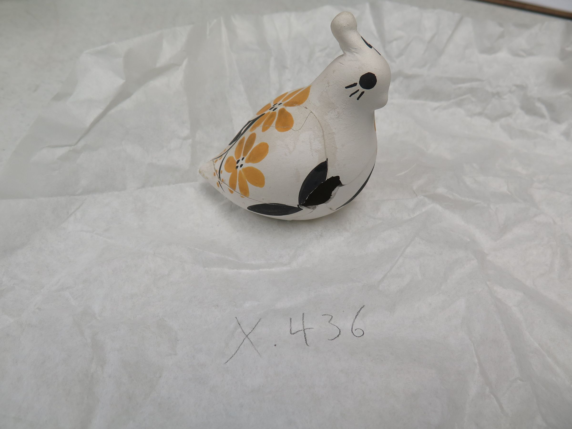 This is a white quail figurine with black leaves and orange flowers on the side and the text "S. Chino Acoma" on the bottom. The figurine has been broken and repaired. The figurine measures 3.5" (h) x 3.75" (w) x 2.75" (l).