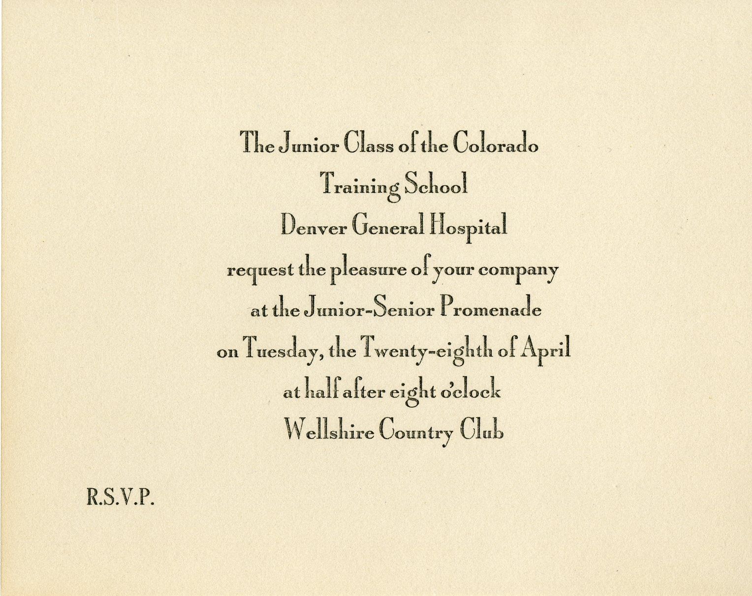 Invitation to the Junior-Senior Promenade, with envelope, given to Ella Mitze, circa 1930. The invitation card and envelope are both 4" x 5.25". The invitation was given out by the Junior class of the training school, connected with Denver General Hospital. Printed text on the front says that the promenade was scheduled for April 28 at 8:30 pm, year not specified, at the Wellshire Country Club. The message "R.S.V.P" is in the lower left corner.