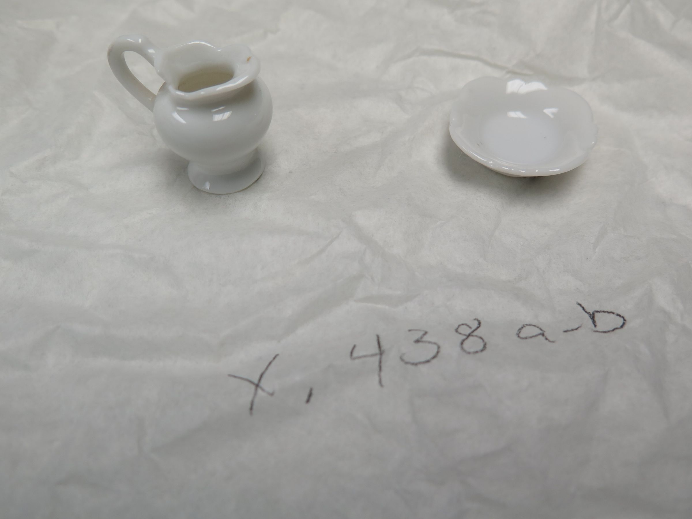 This is a miniature white pitcher and basin. The pitcher measures 1.5" (h) x 1.5" (dia). The basin measures 0.25" (h) x 1.75" (dia).