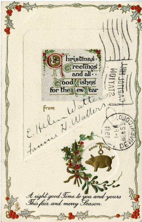 A Christmas and New Years postcard, dated December 27, 1911. The card is 3.5" x 5.5", white, with a color border resembling holly leaves and berries in the corners. The printed message "Christmas greetings and all Good Wishes for the New Year" is featured in the center with stylized gold and black lettering and holly adornment. A designated "From" area below the message has the names E. Helen Watters and Fannie H. Watters handwritten in ink. A raised image of a hanging gold pig ornament is depicted near the lower right corner, with holly and bows to its left. The message "A right good Time to you and yours This fair and merry Season" is presented at the bottom edge.