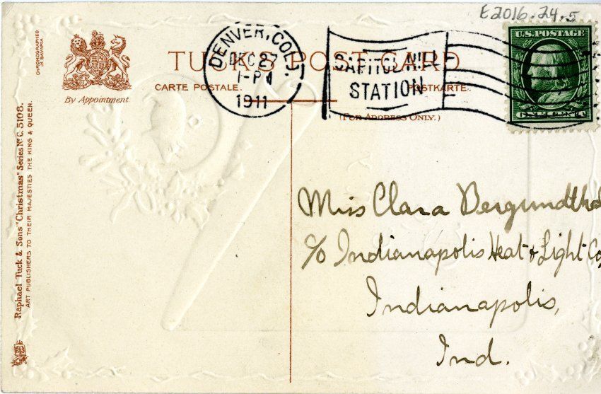 The reverse side has an ink post office stamp, along with the original postage stamp. Information on the postcard's series is printed in red lettering along the left edge, "Raphael Tuck & Sons 'Christmas' Series No C.5108." The brand of postcard is Tuck Postcards. The card is addressed to a Miss Clara Bergundthd in Indianapolis.Collection
